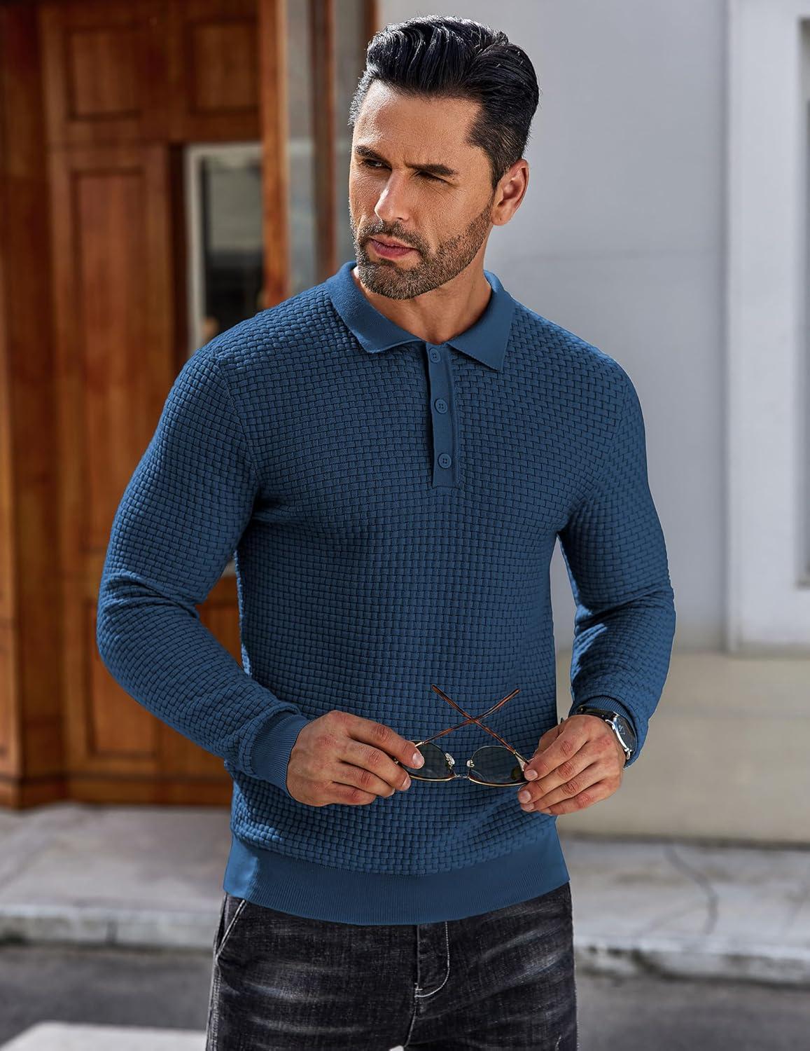 COOFANDY Men's Knit Polo Shirts Long Sleeve Sweater Polo Lightweight Fashion Casual Collared T Shirts(Dark Blue)