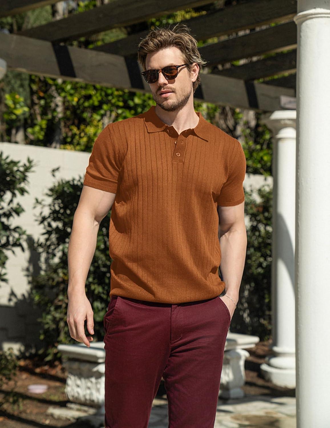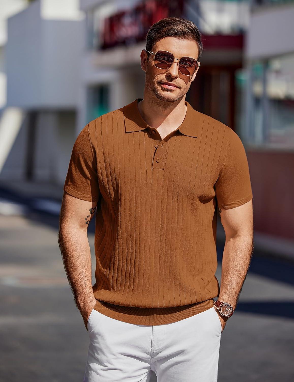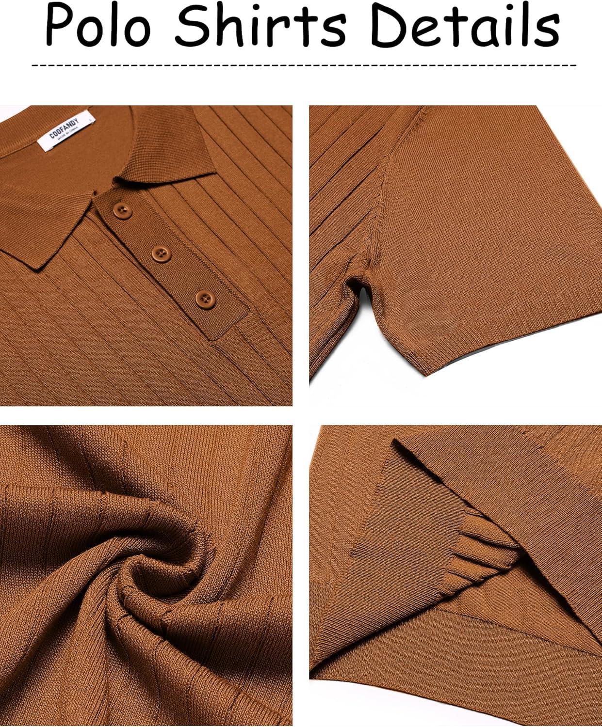 COOFANDY Men’s Knit Polo Shirts Short Sleeve Ribbed Knitted Shirt Summer Lightweight Casual Golf Shirts(Brown)