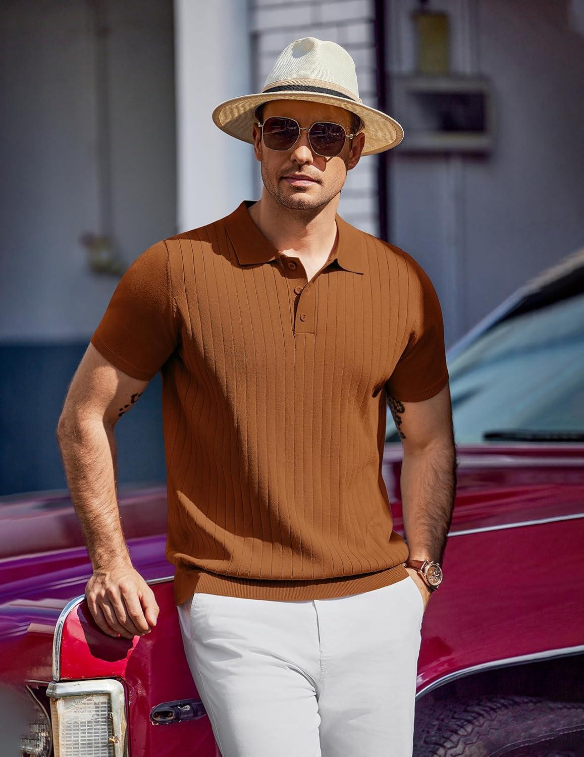 COOFANDY Men's Knit Polo Shirts Short Sleeve Ribbed Knitted Shirt Summer Lightweight Casual Golf Shirts(Brown)