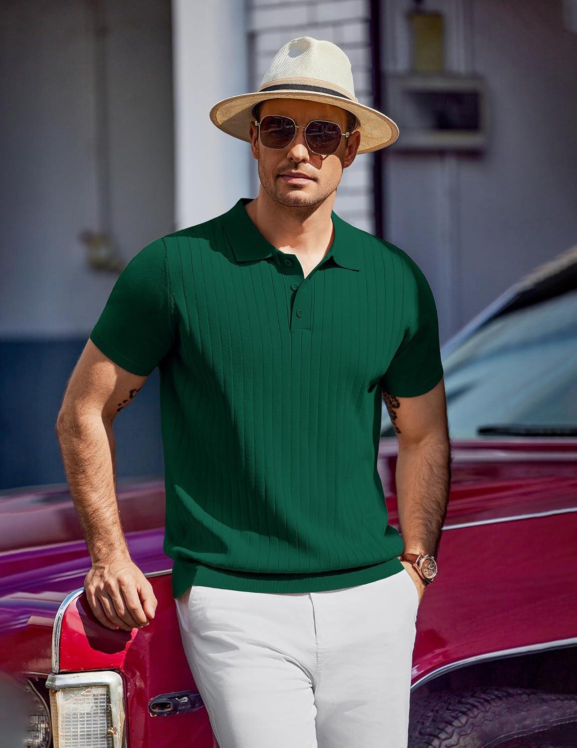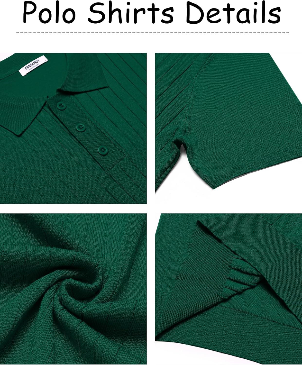COOFANDY Men's Knit Polo Shirts Short Sleeve Ribbed Knitted Shirt Summer Lightweight Casual Golf Shirts(Deep Green)