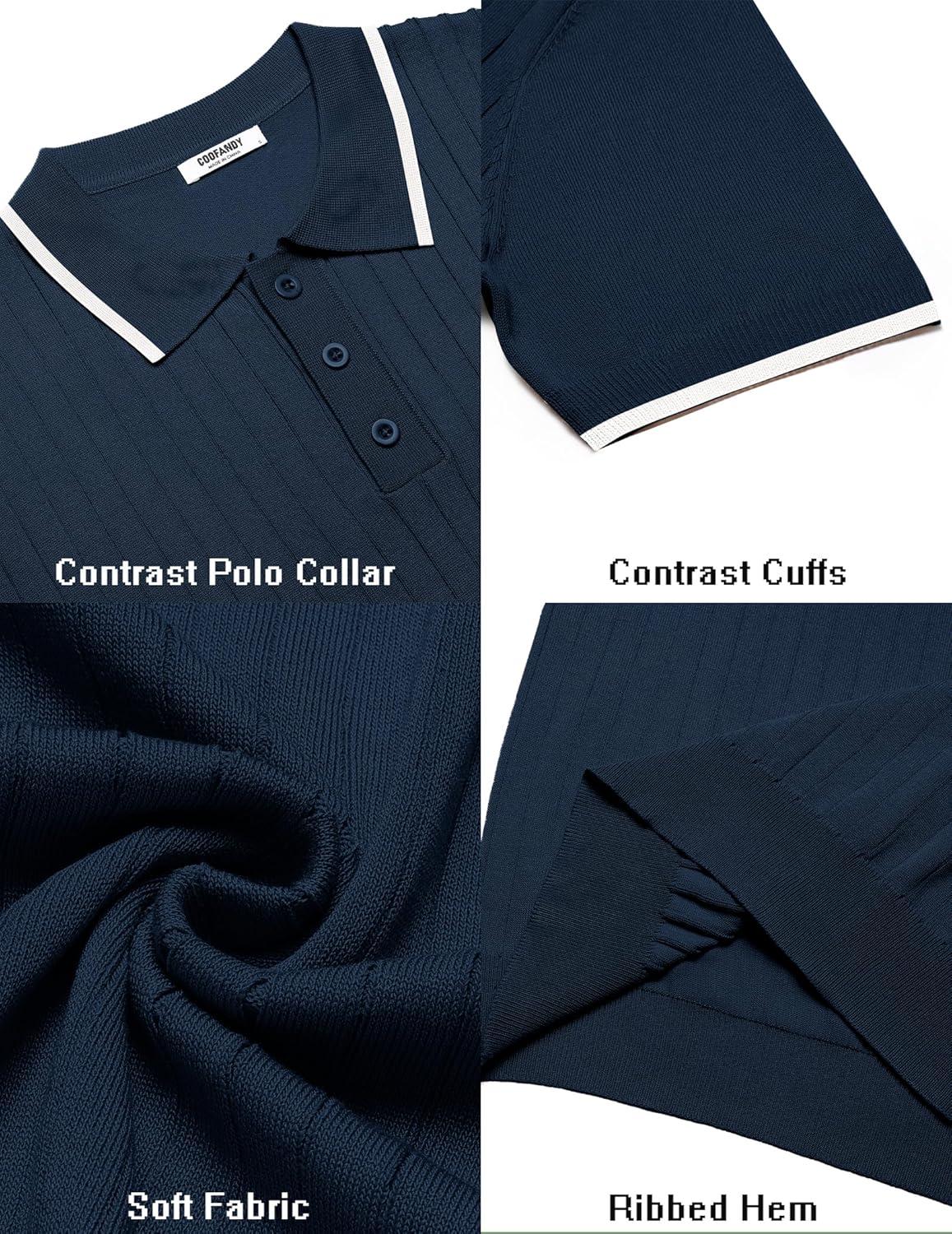 COOFANDY Men's Knit Polo Shirts Short Sleeve Ribbed Knitted Shirt Summer Lightweight Casual Golf Shirts(Navy Blue-white)