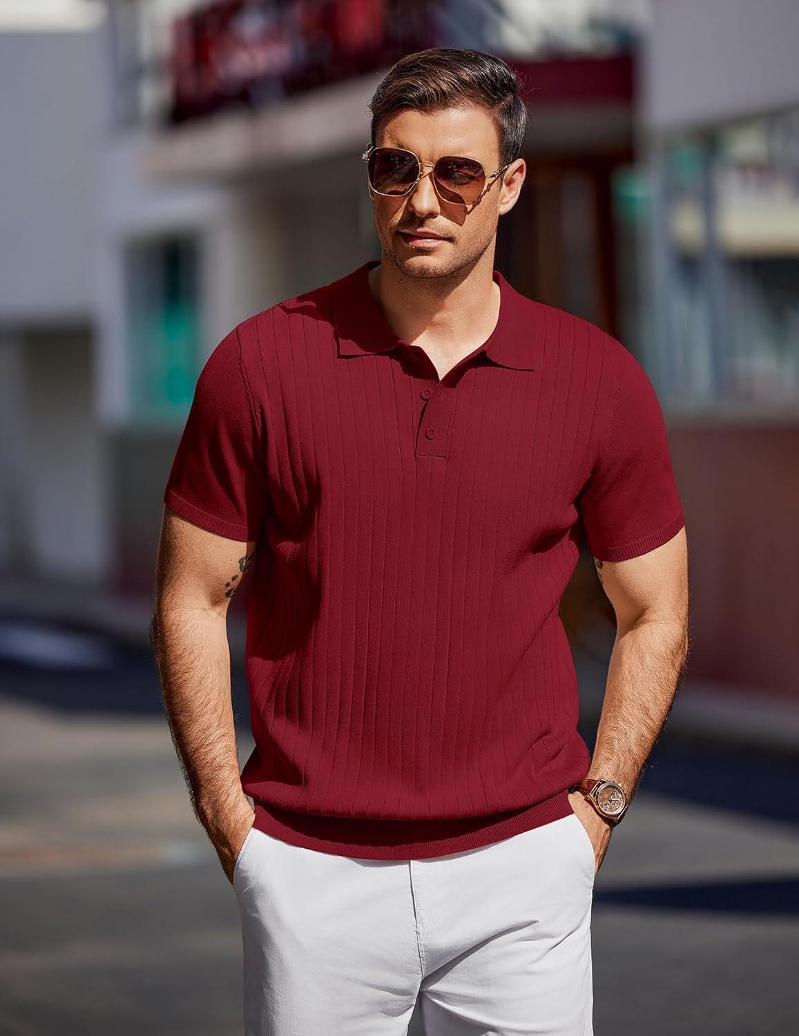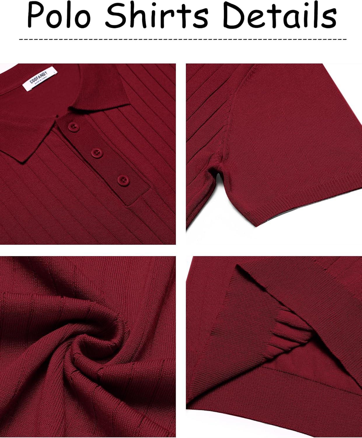 COOFANDY Men's Knit Polo Shirts Short Sleeve Ribbed Knitted Shirt Summer Lightweight Casual Golf Shirts(Wine Red)