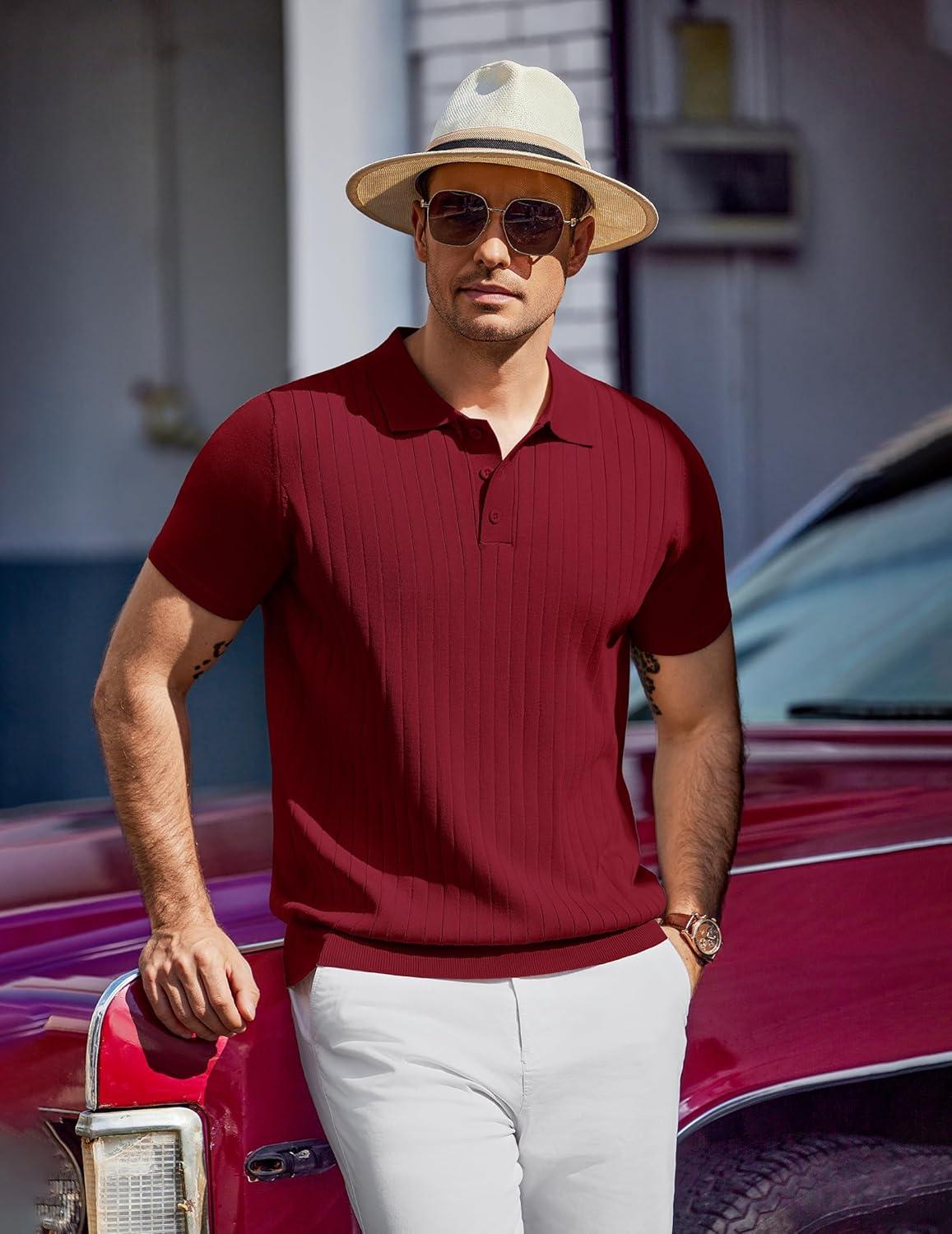COOFANDY Men’s Knit Polo Shirts Short Sleeve Ribbed Knitted Shirt Summer Lightweight Casual Golf Shirts(Wine Red)