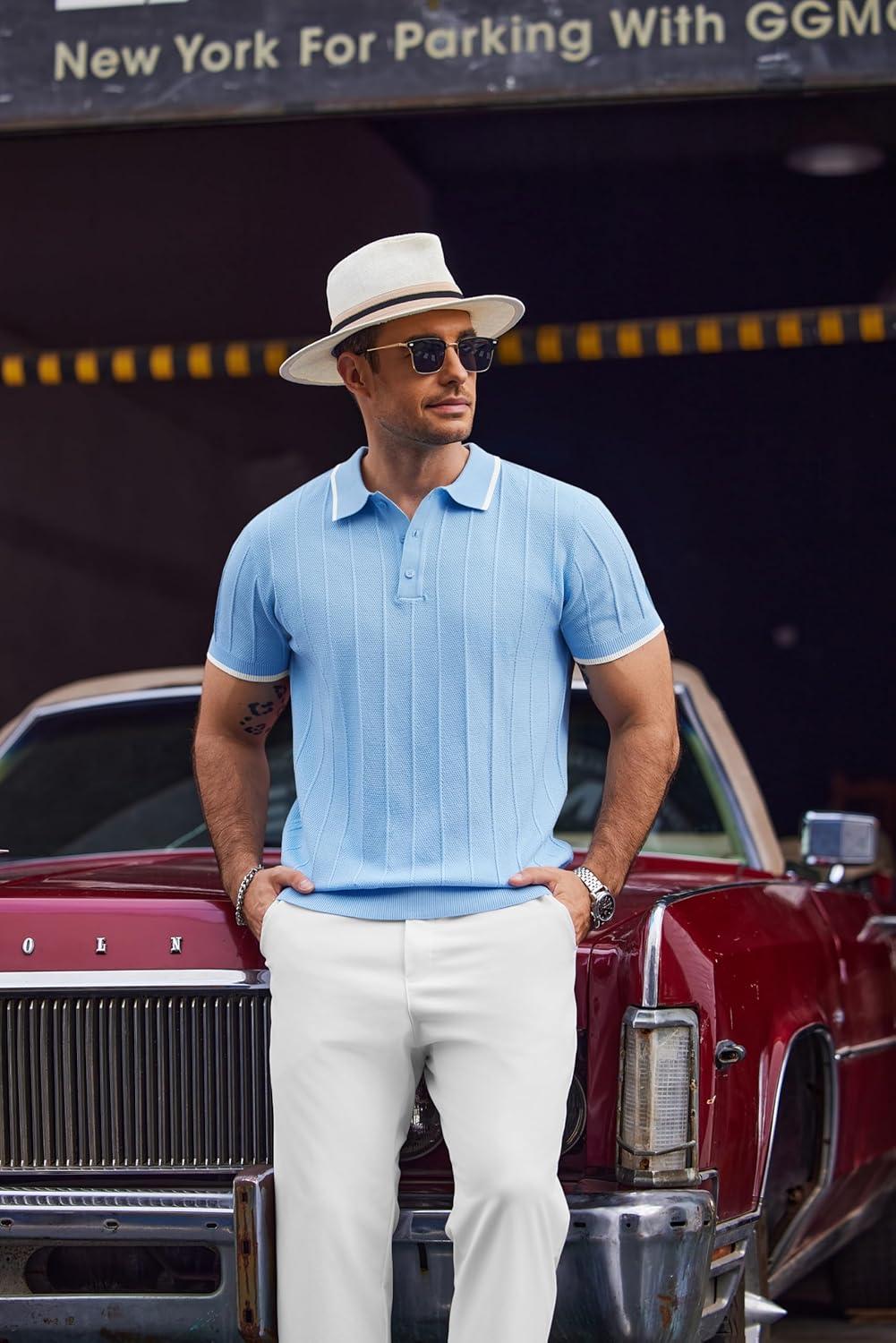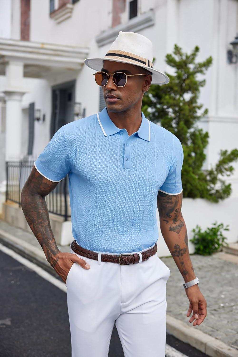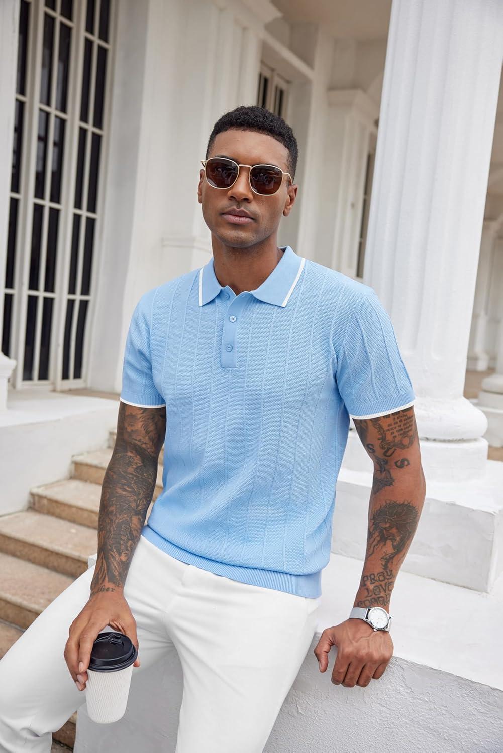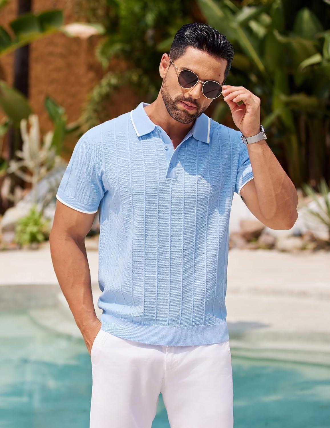 Get up to 50% off on COOFANDY Mens Knit Polo Shirts Short Sleeve Ribbed Textured Polo Shirt Lightweight Casual Golf Shirts Collared T Shirt(Light Blue White Striped) styles during our spring sale event.