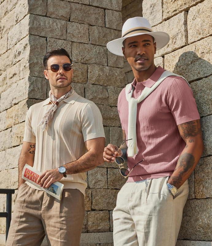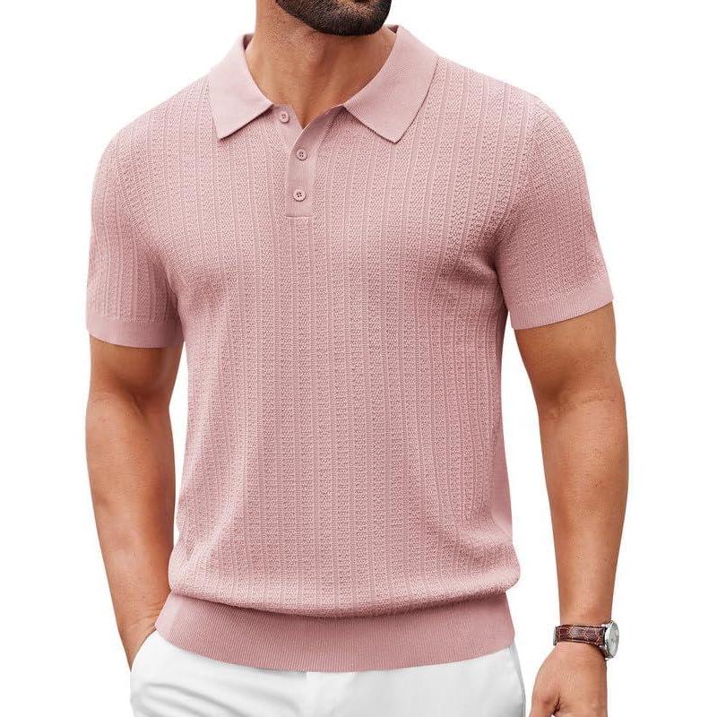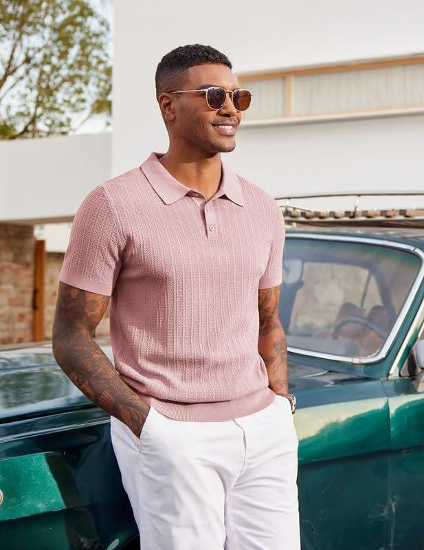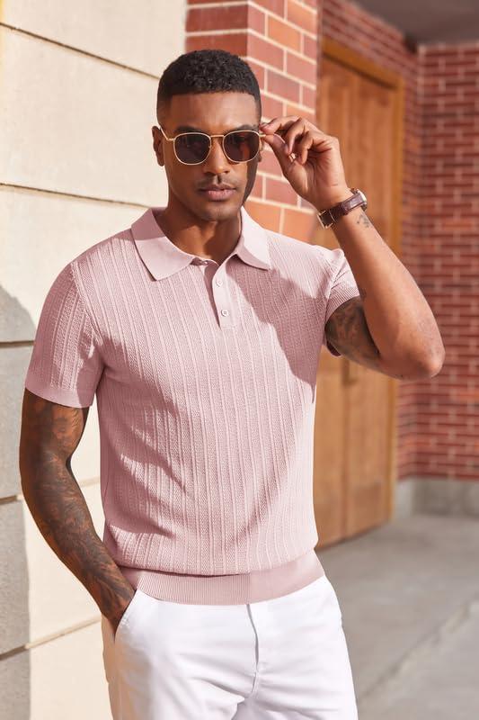 COOFANDY Mens Knit Polo Shirts Short Sleeve Slim Fit Textured Golf Polo Shirt Casual Summer Vacation T-Shirts(Pink)