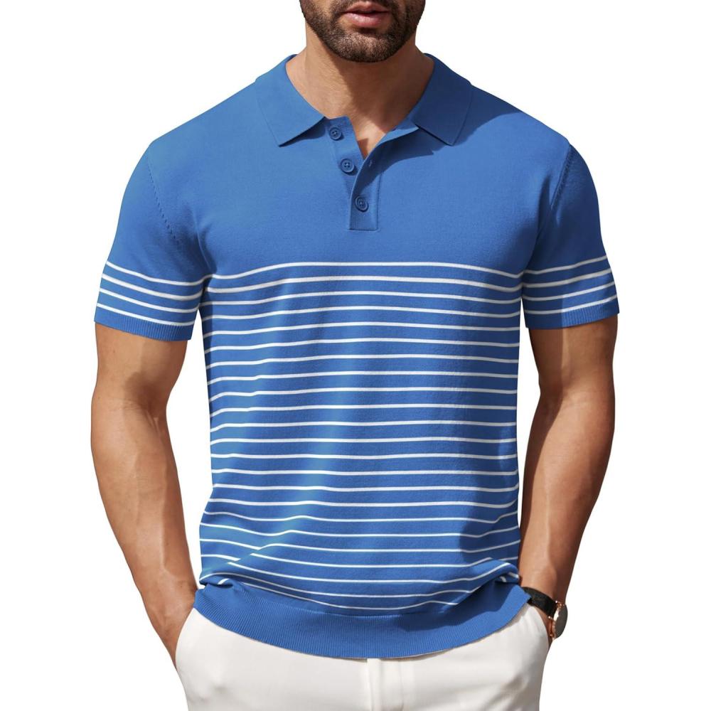 COOFANDY Men's Knit Polo Shirts Short Sleeve Striped Golf Polo Shirts Lightweight Casual Collared T Shirt(Blue (White Stripes))