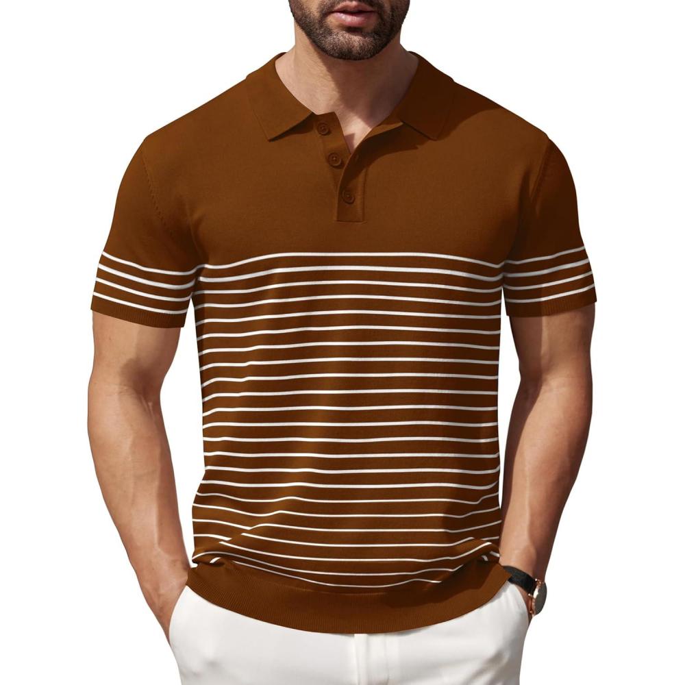COOFANDY Men’s Knit Polo Shirts Short Sleeve Striped Golf Polo Shirts Lightweight Casual Collared T Shirt(Caramel (White Stripes))