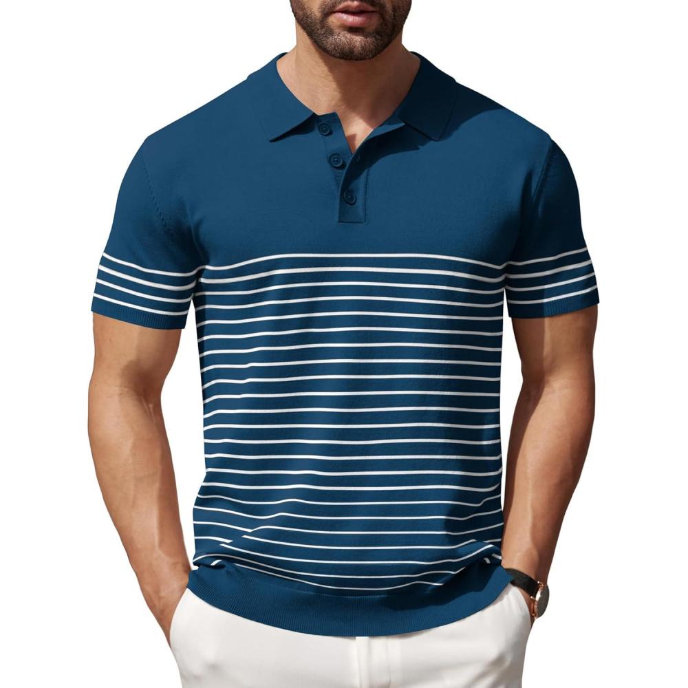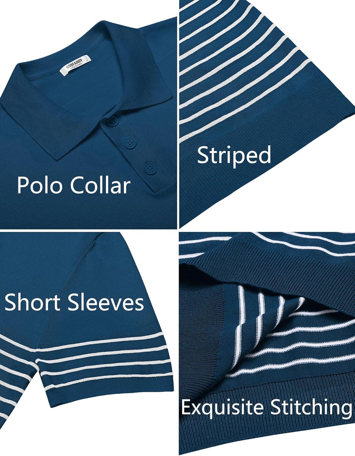 COOFANDY Men's Knit Polo Shirts Short Sleeve Striped Golf Polo Shirts Lightweight Casual Collared T Shirt(Denim Blue (White Stripes))