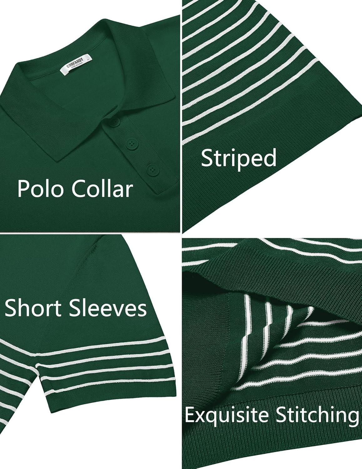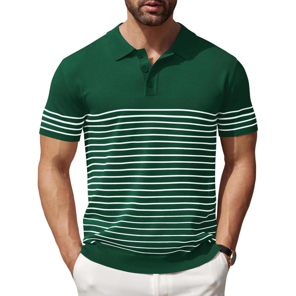 COOFANDY Men's Knit Polo Shirts Short Sleeve Striped Golf Polo Shirts Lightweight Casual Collared T Shirt(Green (White Stripes))