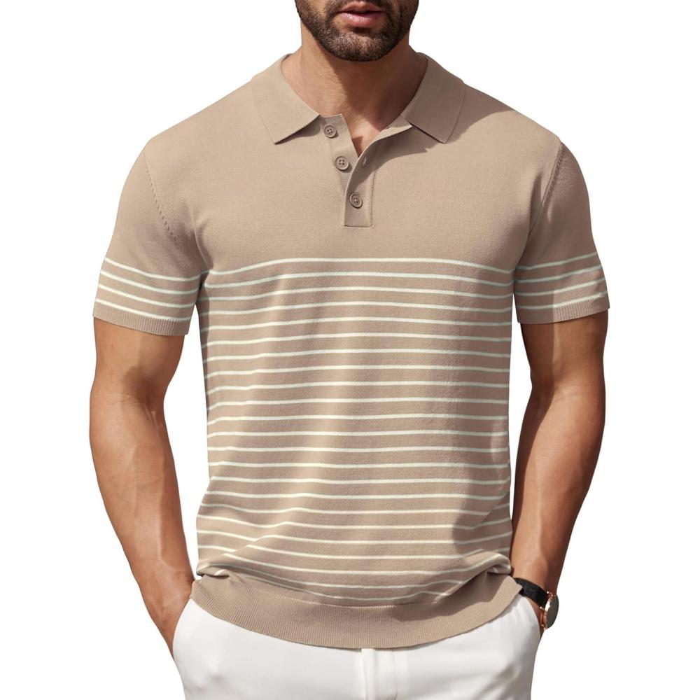 COOFANDY Men's Knit Polo Shirts Short Sleeve Striped Golf Polo Shirts Lightweight Casual Collared T Shirt(Khaki (Beige Stripes))