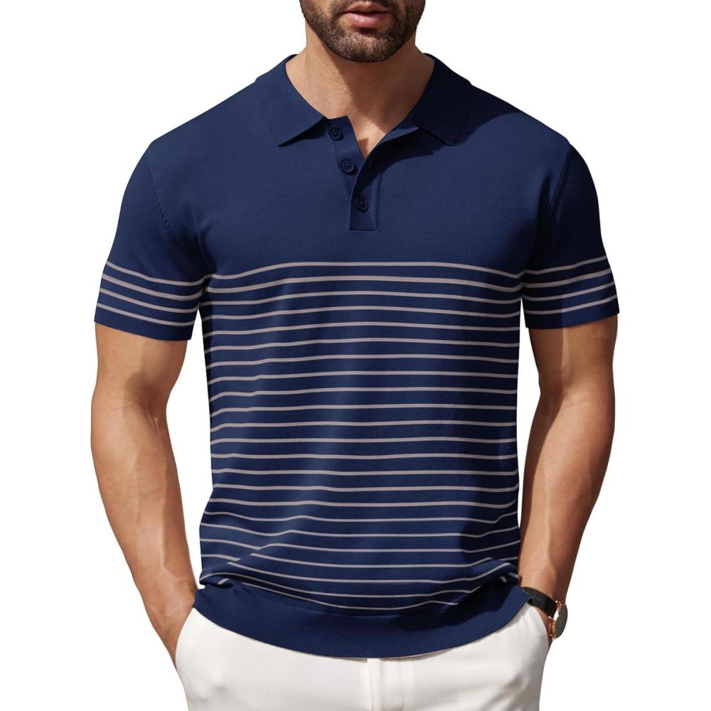 COOFANDY Men's Knit Polo Shirts Short Sleeve Striped Golf Polo Shirts Lightweight Casual Collared T Shirt(Navy Blue (Grey Stripes))