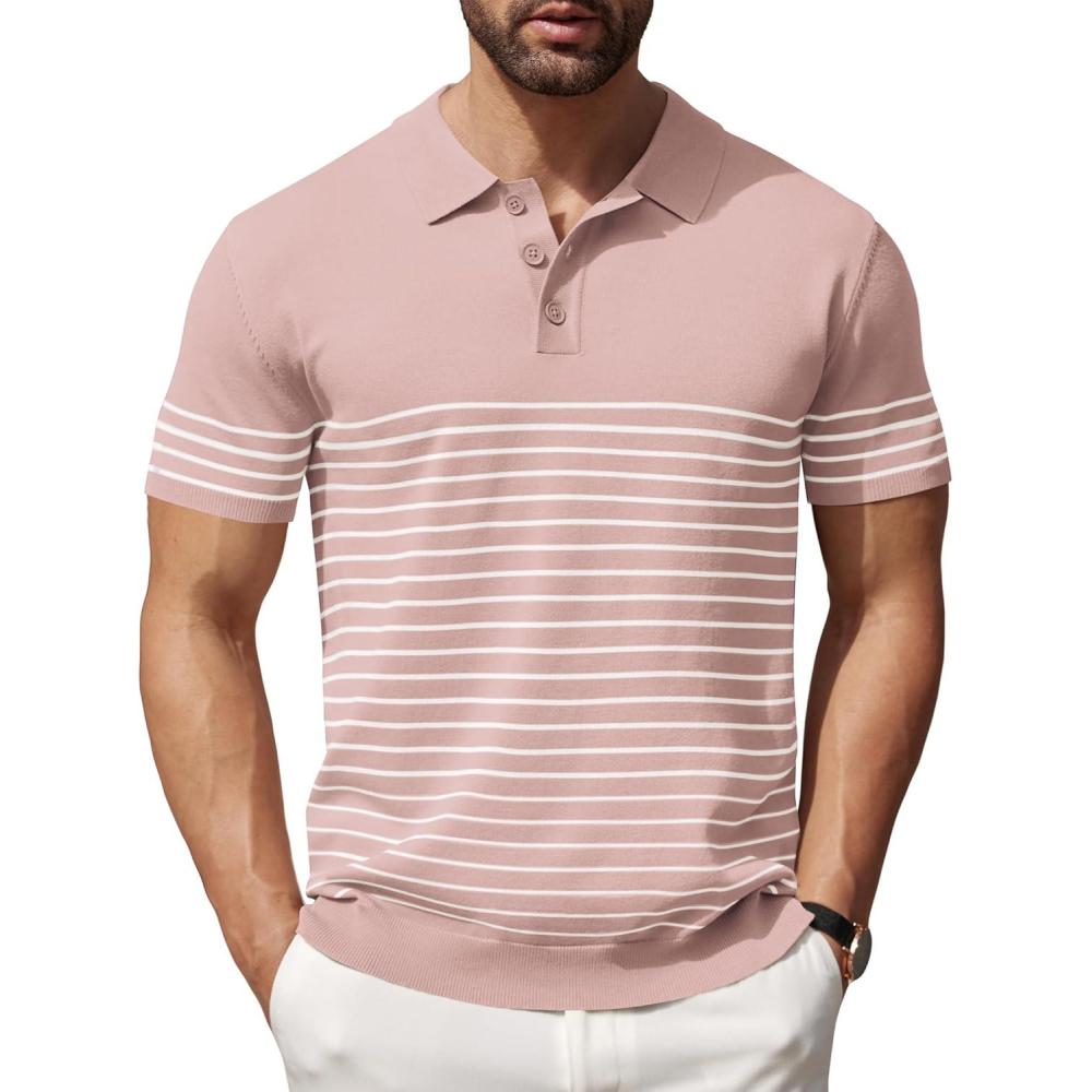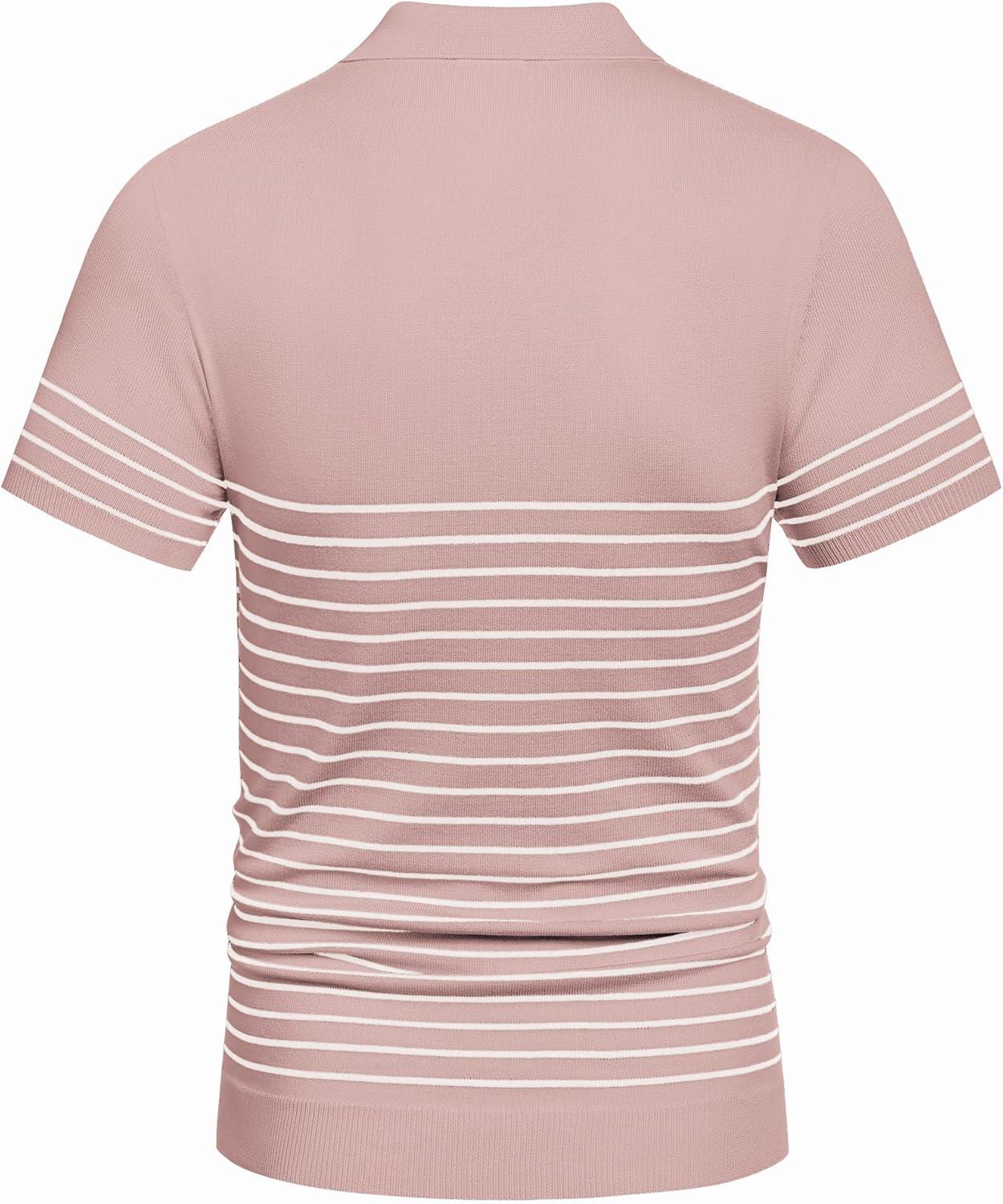 COOFANDY Men's Knit Polo Shirts Short Sleeve Striped Golf Polo Shirts Lightweight Casual Collared T Shirt(Pink (White Stripes))