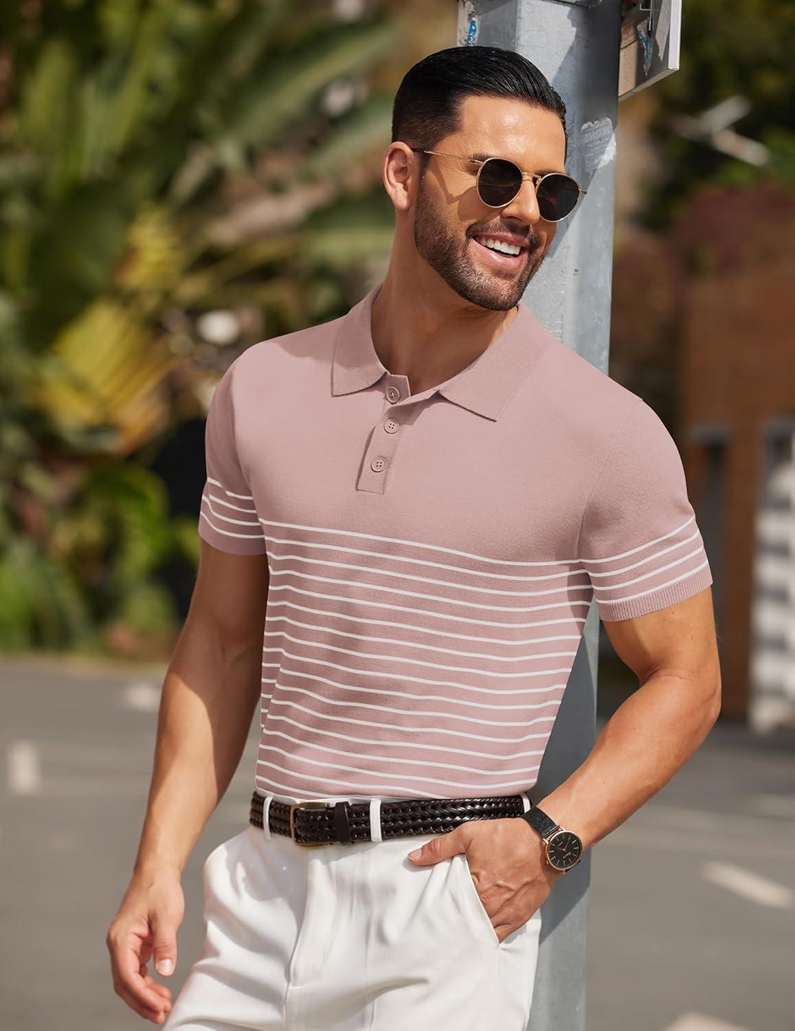 Don’t break the bank! Get the COOFANDY Men’s Knit Polo Shirts Short Sleeve Striped Golf Polo Shirts Lightweight Casual Collared T Shirt(Pink (White Stripes)) you want at a price you can afford during our markdown sale.