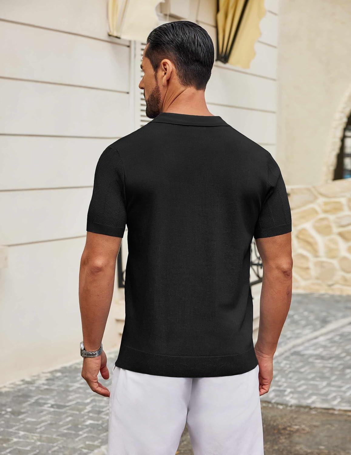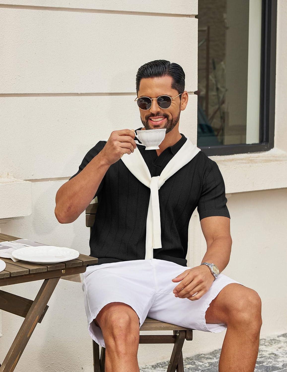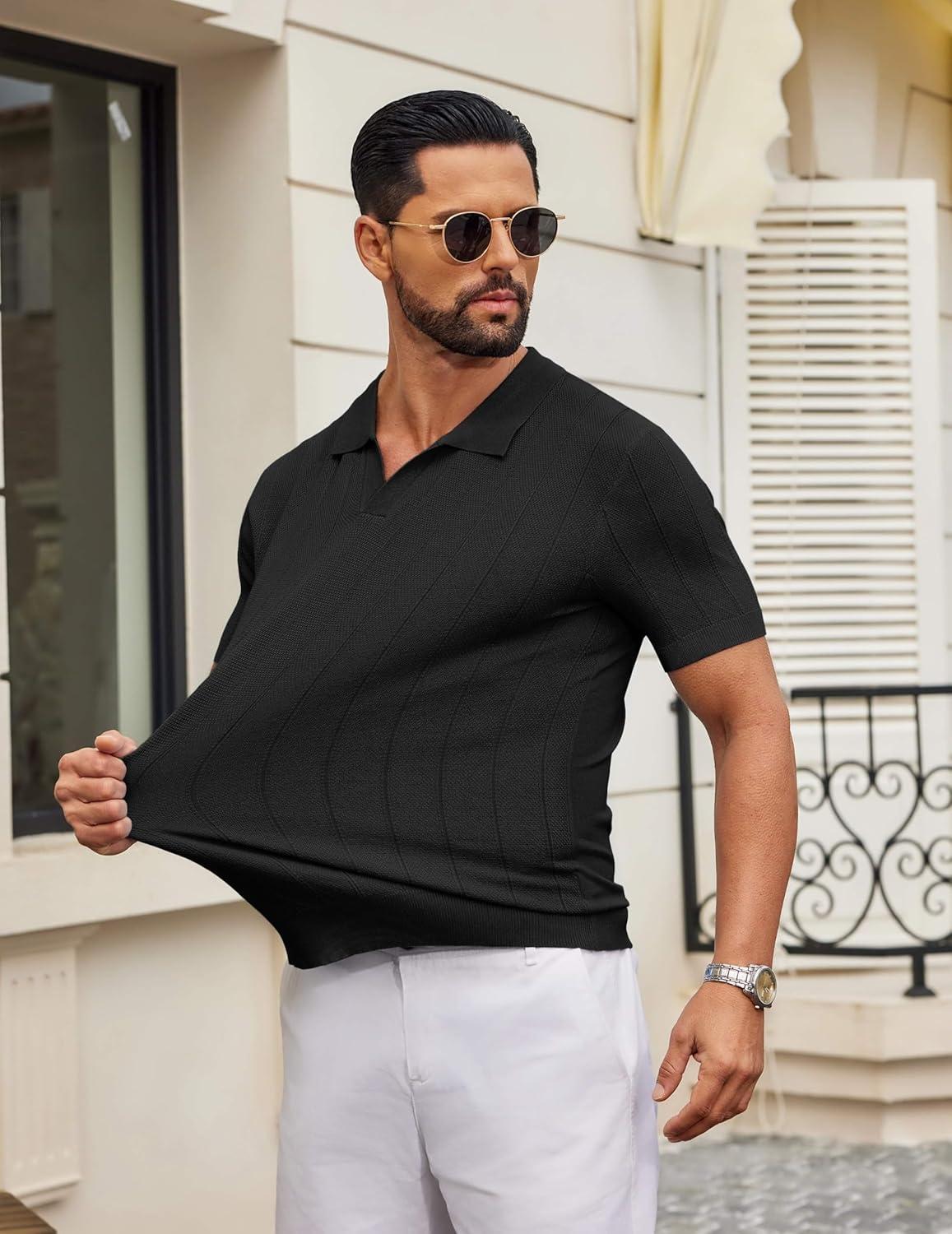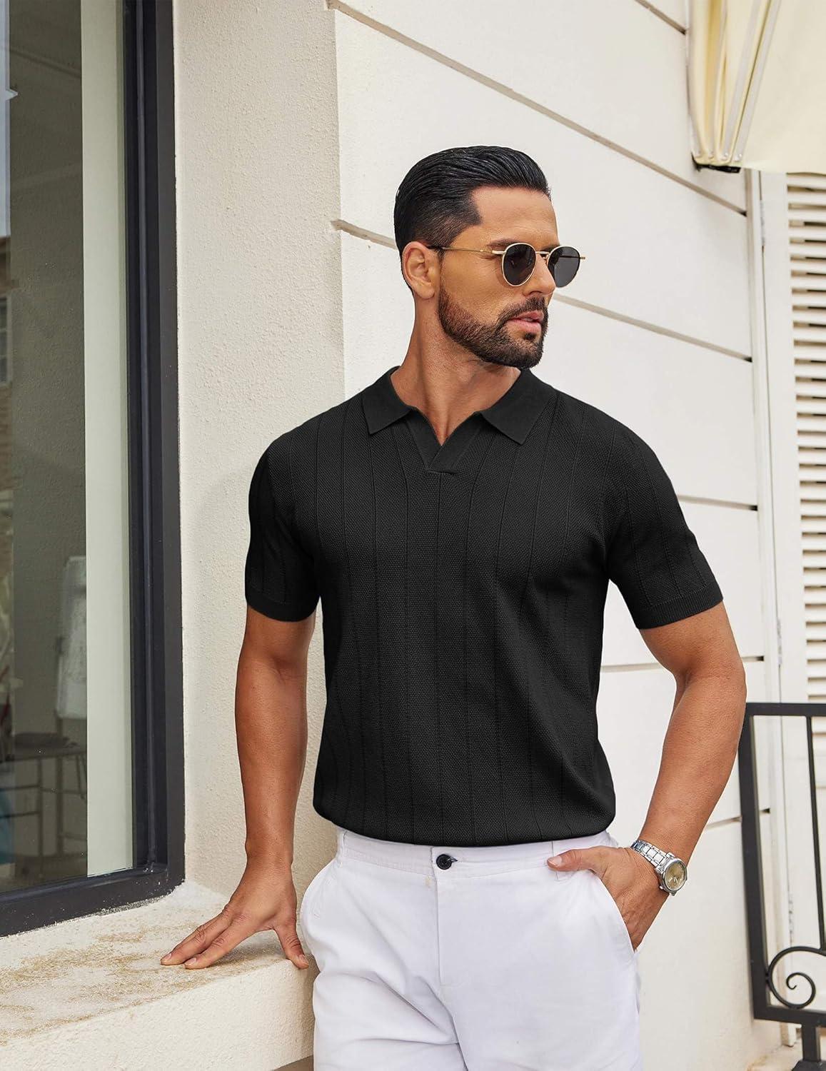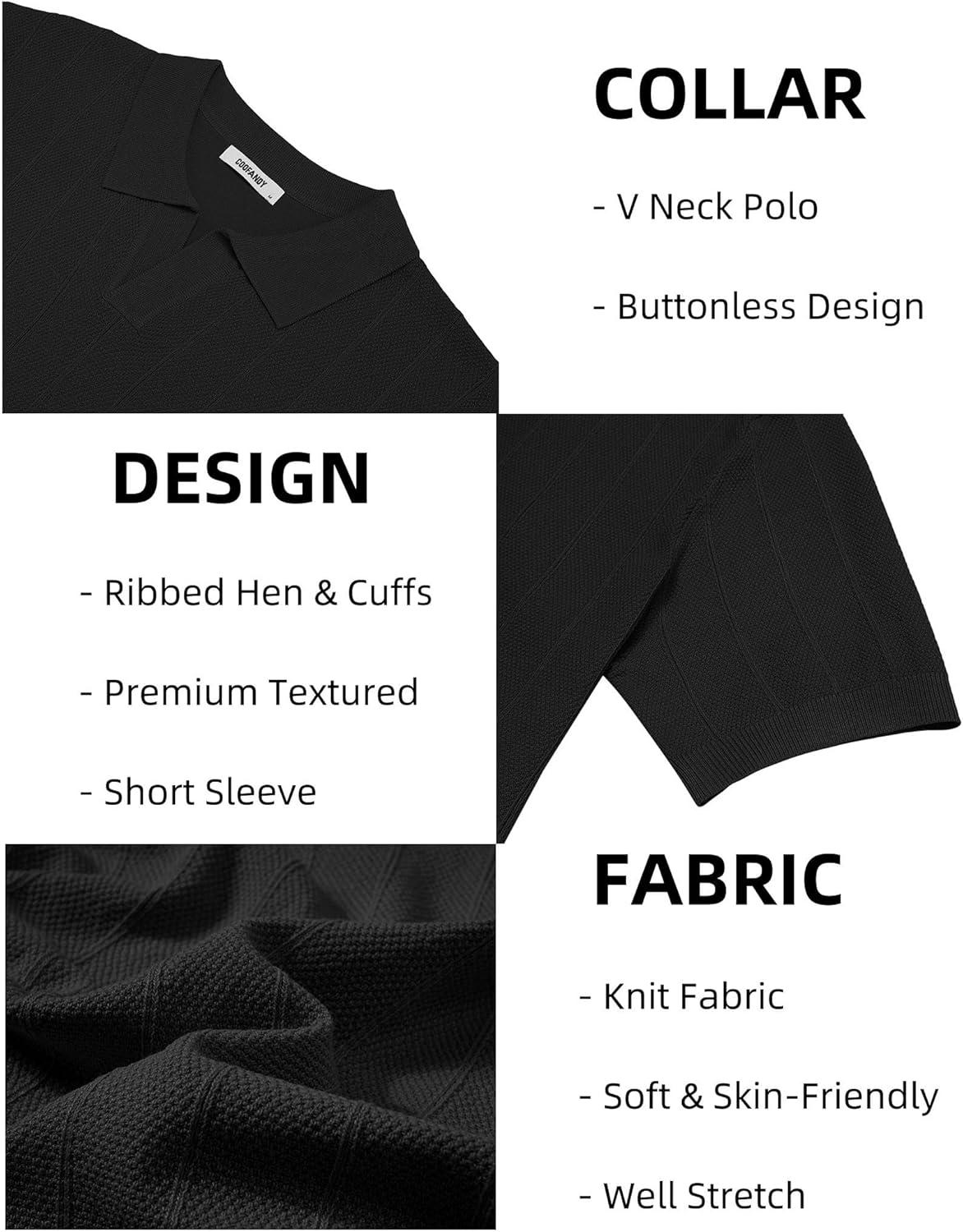 COOFANDY Mens Knit Polo Shirts V Neck Short Sleeve Ribbed Textured Polo Shirt Stretch Casual Golf Shirts Collared T Shirt(Black)