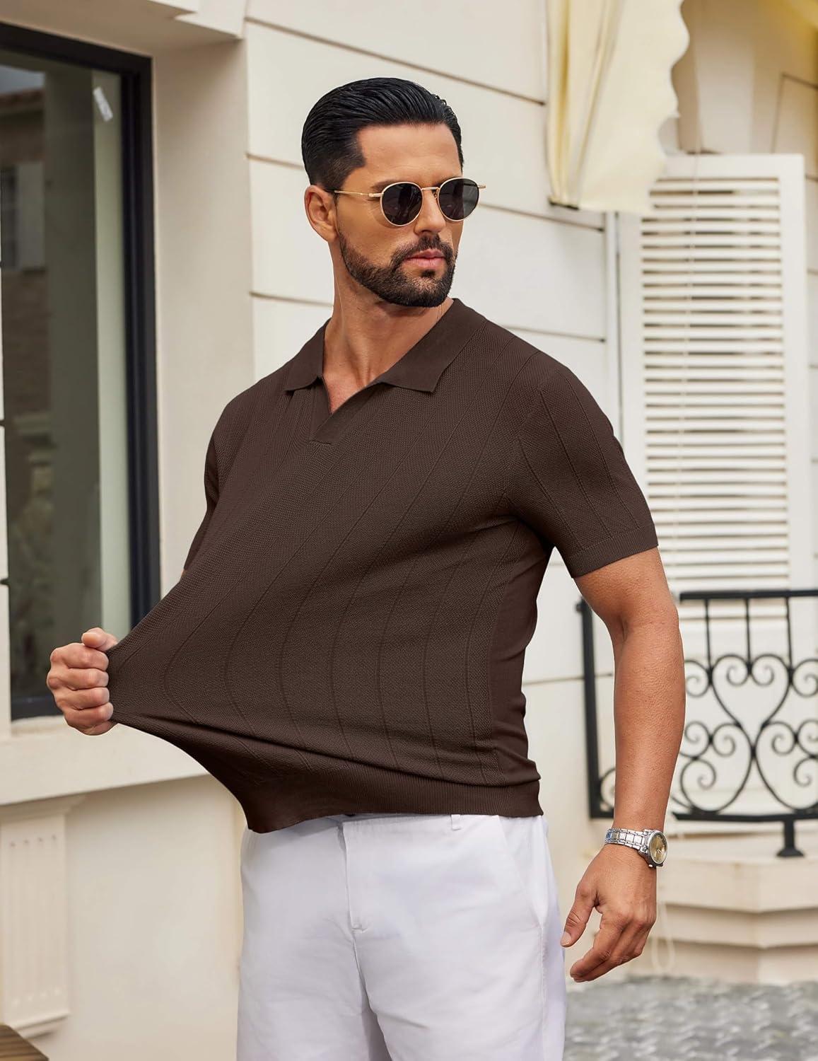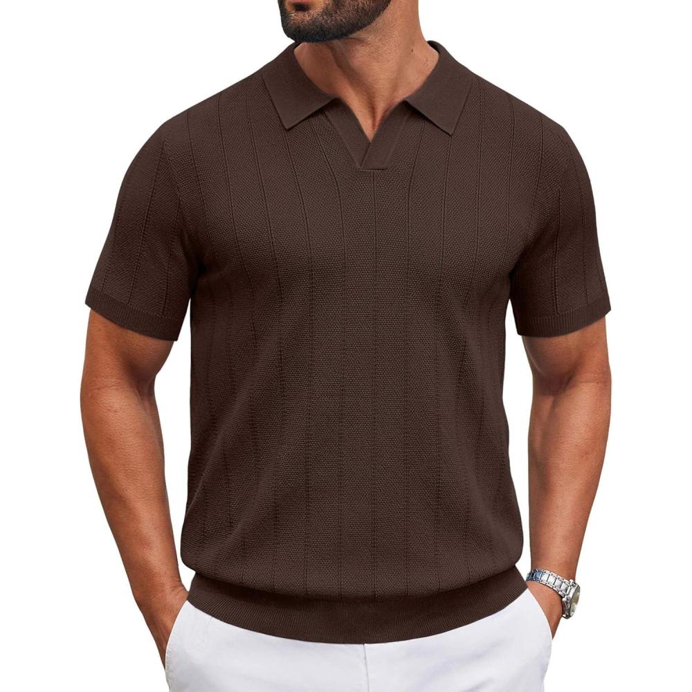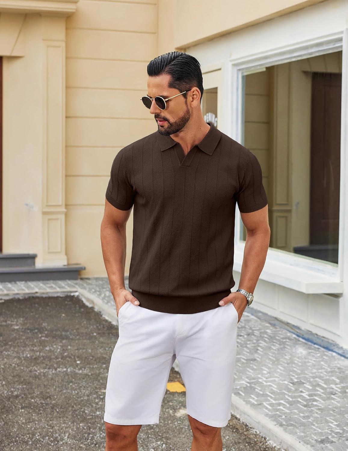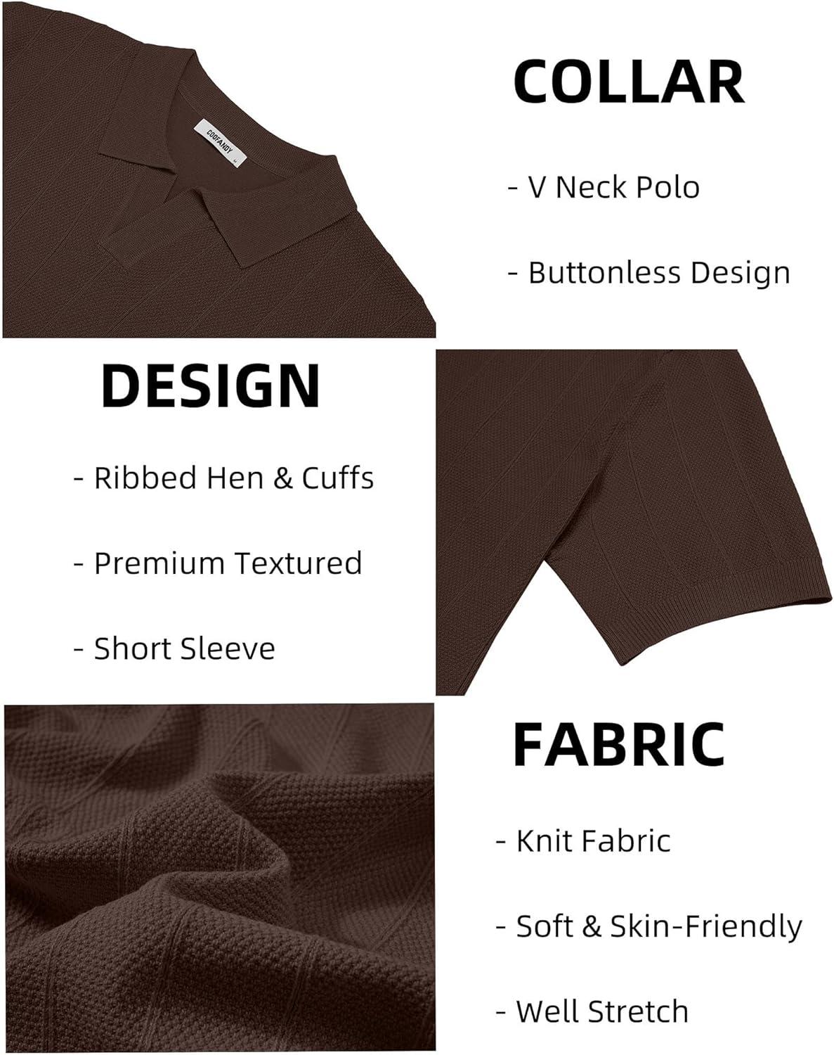 COOFANDY Mens Knit Polo Shirts V Neck Short Sleeve Ribbed Textured Polo Shirt Stretch Casual Golf Shirts Collared T Shirt(Brown)