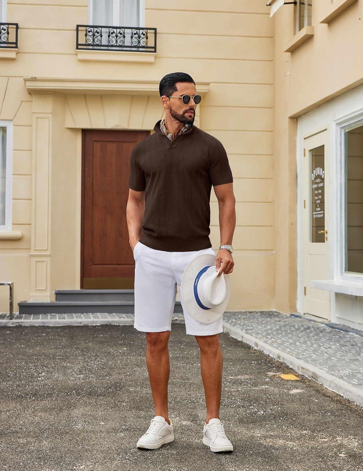 imageCOOFANDY Mens Knit Polo Shirts V Neck Short Sleeve Ribbed Textured Polo Shirt Stretch Casual Golf Shirts Collared T ShirtBrown