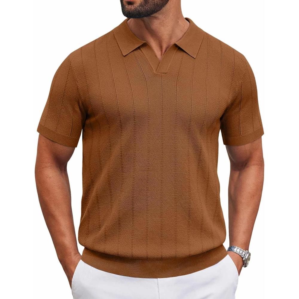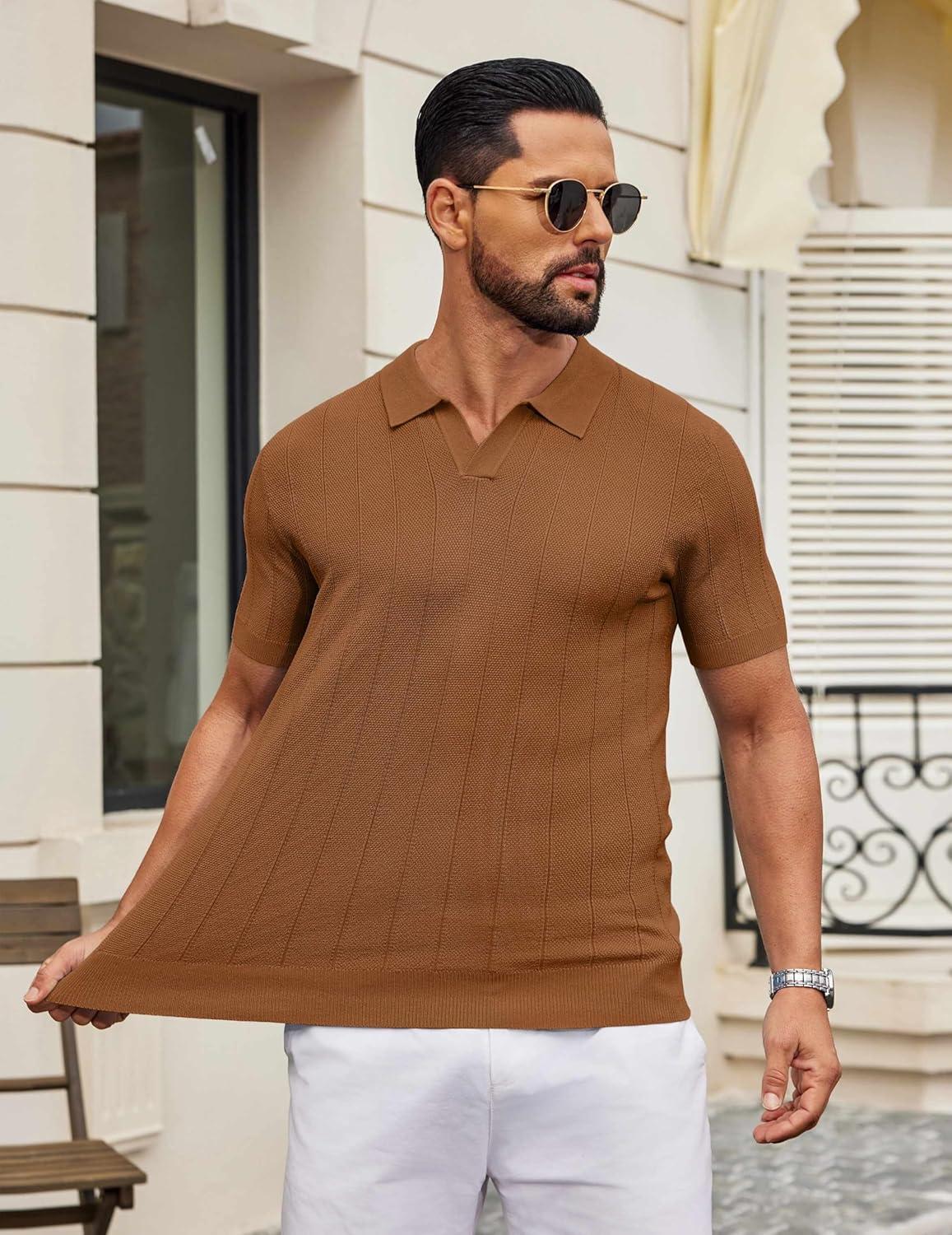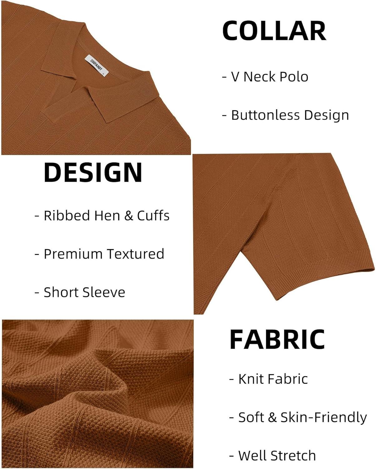 COOFANDY Mens Knit Polo Shirts V Neck Short Sleeve Ribbed Textured Polo Shirt Stretch Casual Golf Shirts Collared T Shirt(Reddish Brown)