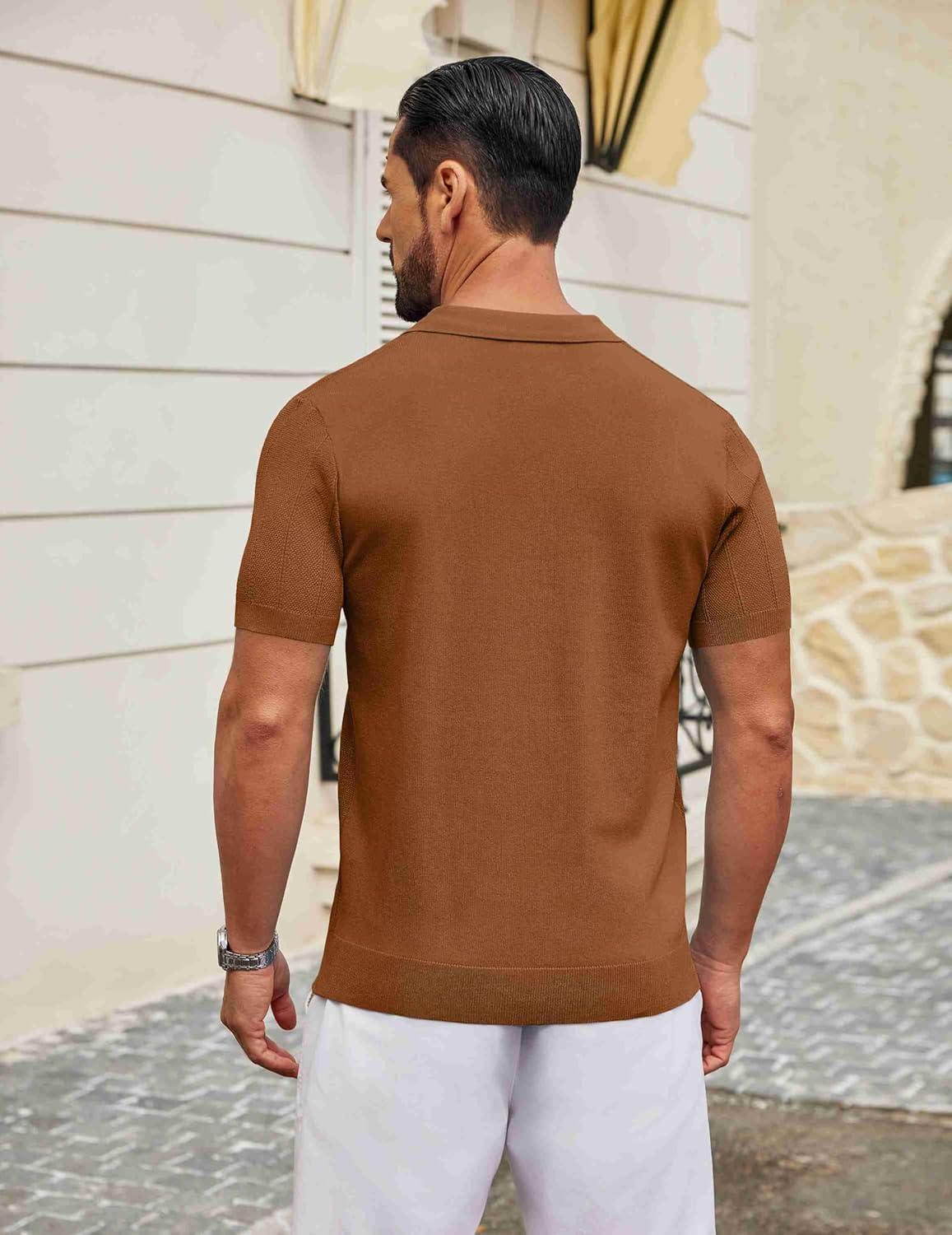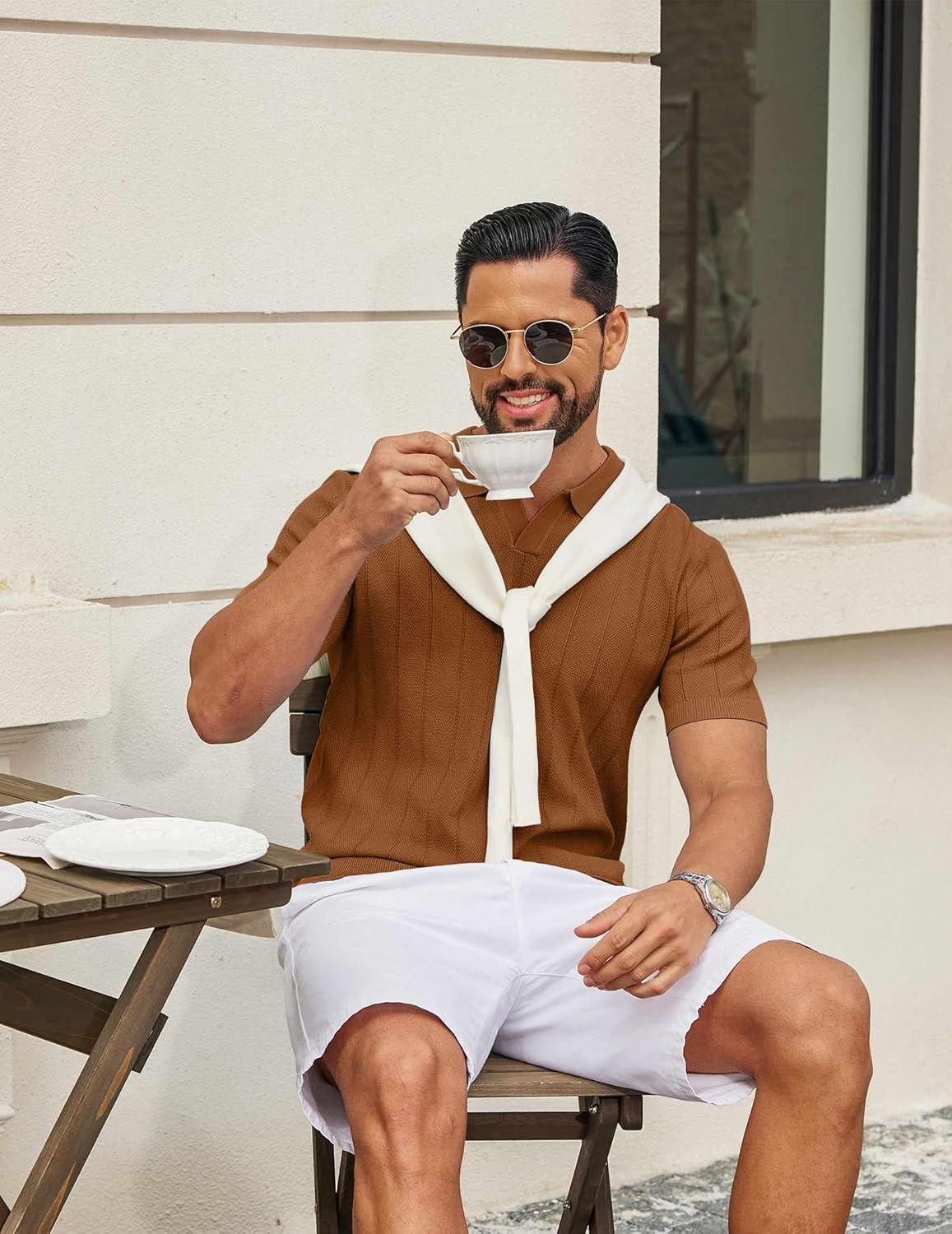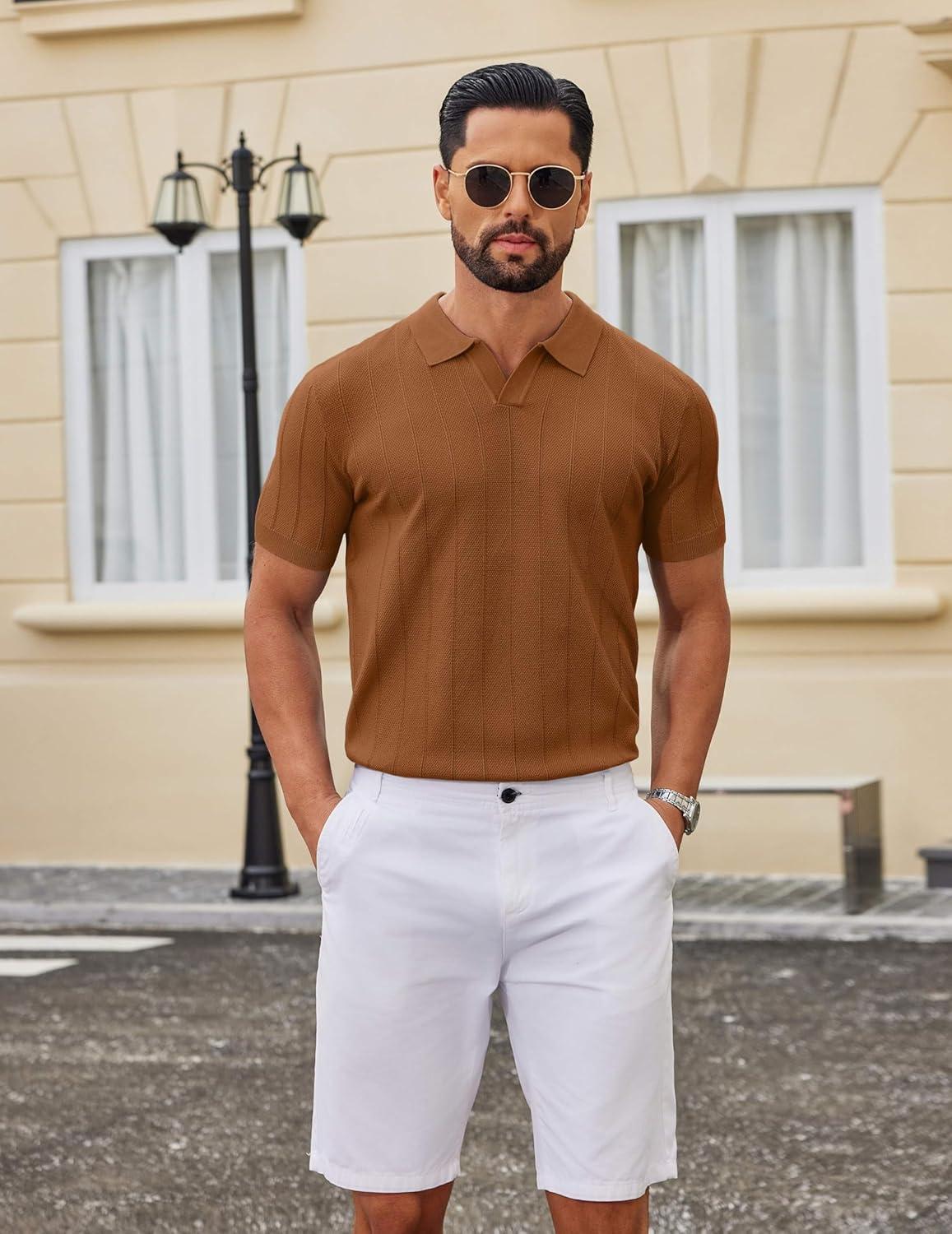 COOFANDY Mens Knit Polo Shirts V Neck Short Sleeve Ribbed Textured Polo Shirt Stretch Casual Golf Shirts Collared T Shirt(Reddish Brown)