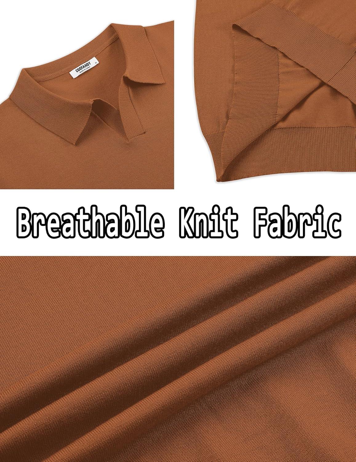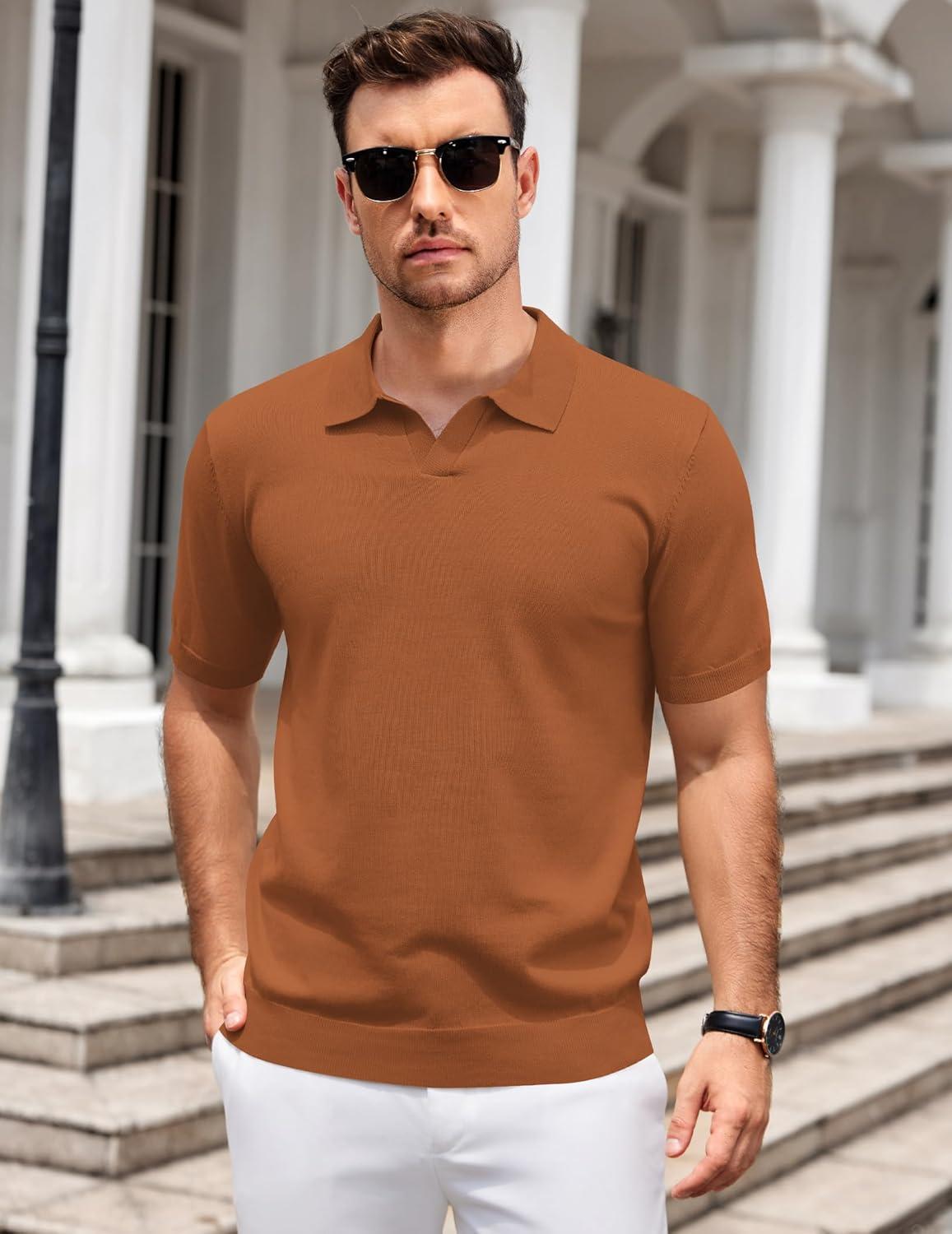 COOFANDY Mens Knit Polo Shirts V Neck Short Sleeve Stretch Polo T Shirt Casual Golf Shirts(Caramel)