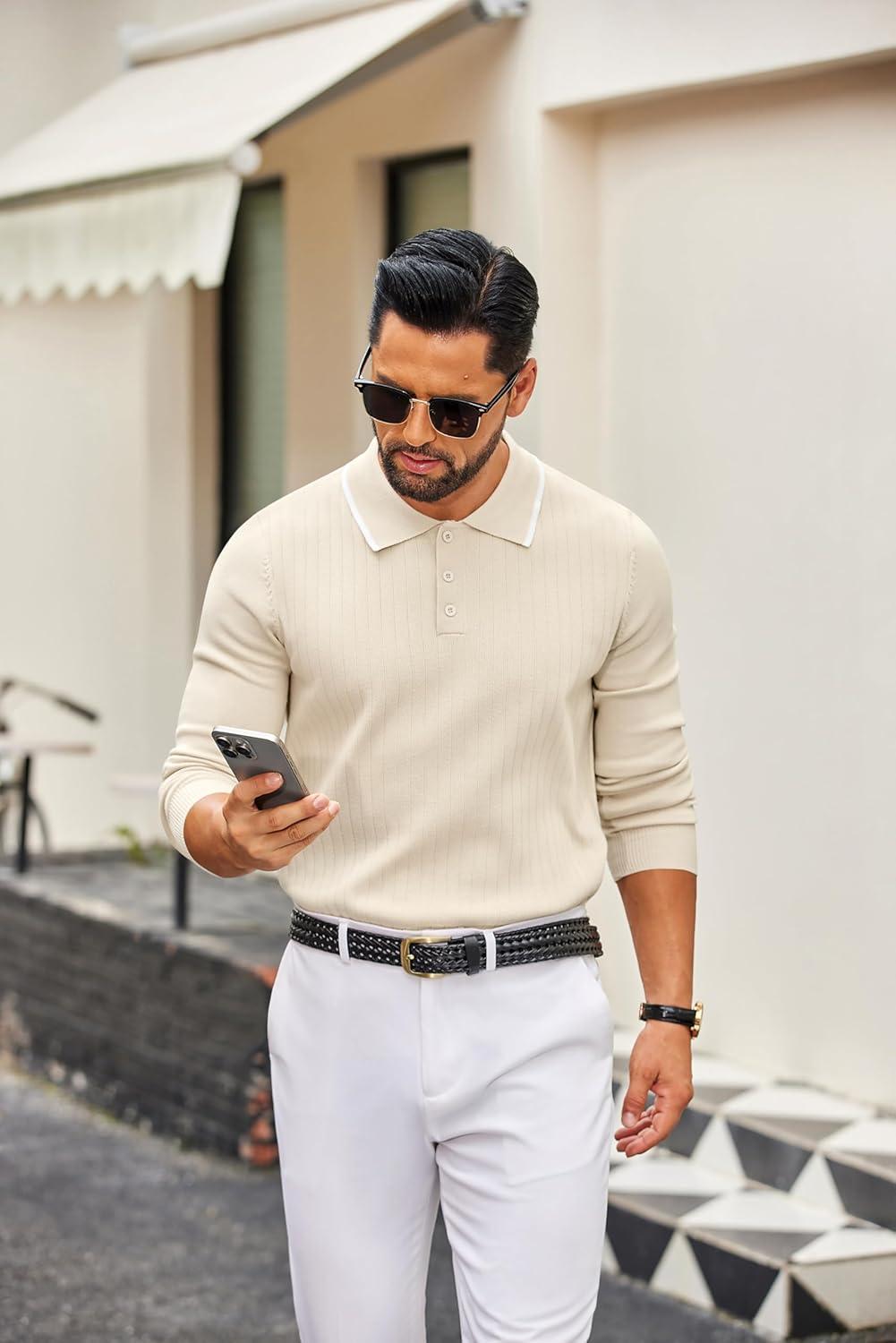 COOFANDY Men's Knit Polo Sweater Casual Long Sleeve Polo Sweater Lightweight Button Down Golf Pullover Sweaters(Beige)