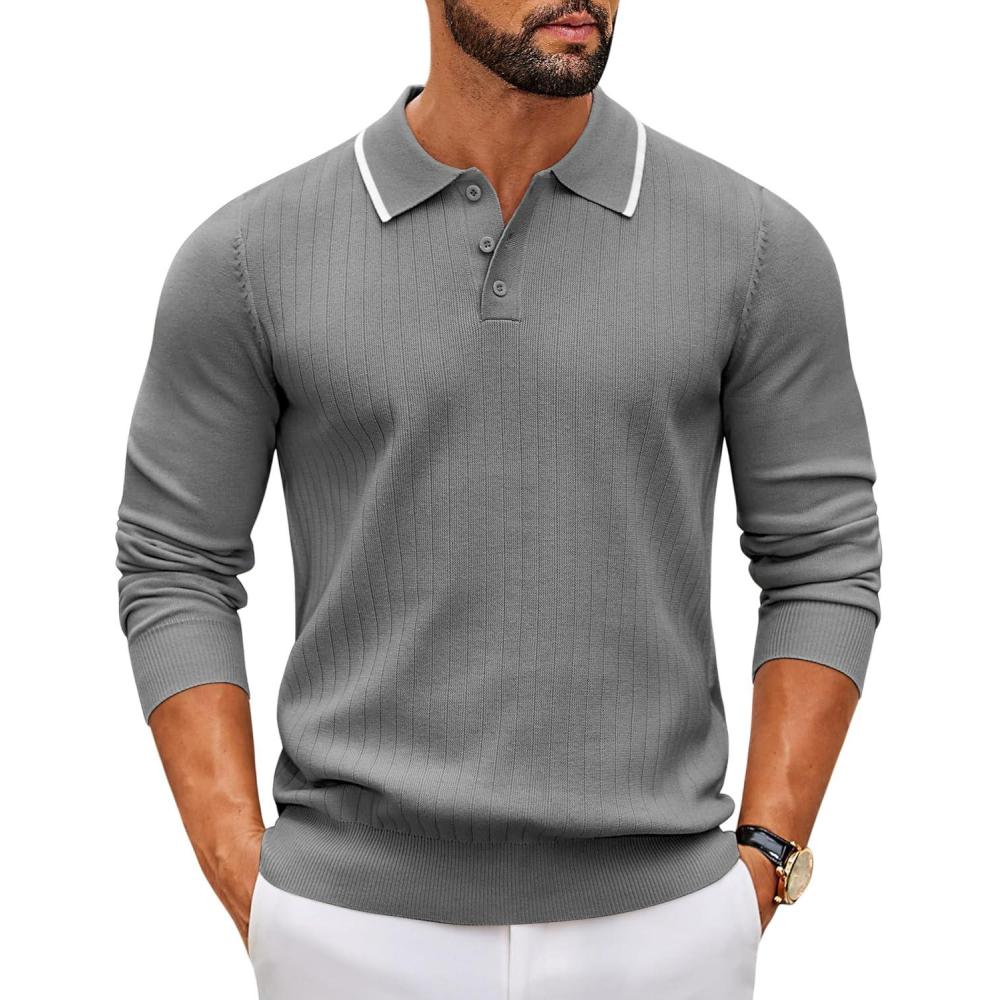 COOFANDY Men's Knit Polo Sweater Casual Long Sleeve Polo Sweater Lightweight Button Down Golf Pullover Sweaters(Grey)