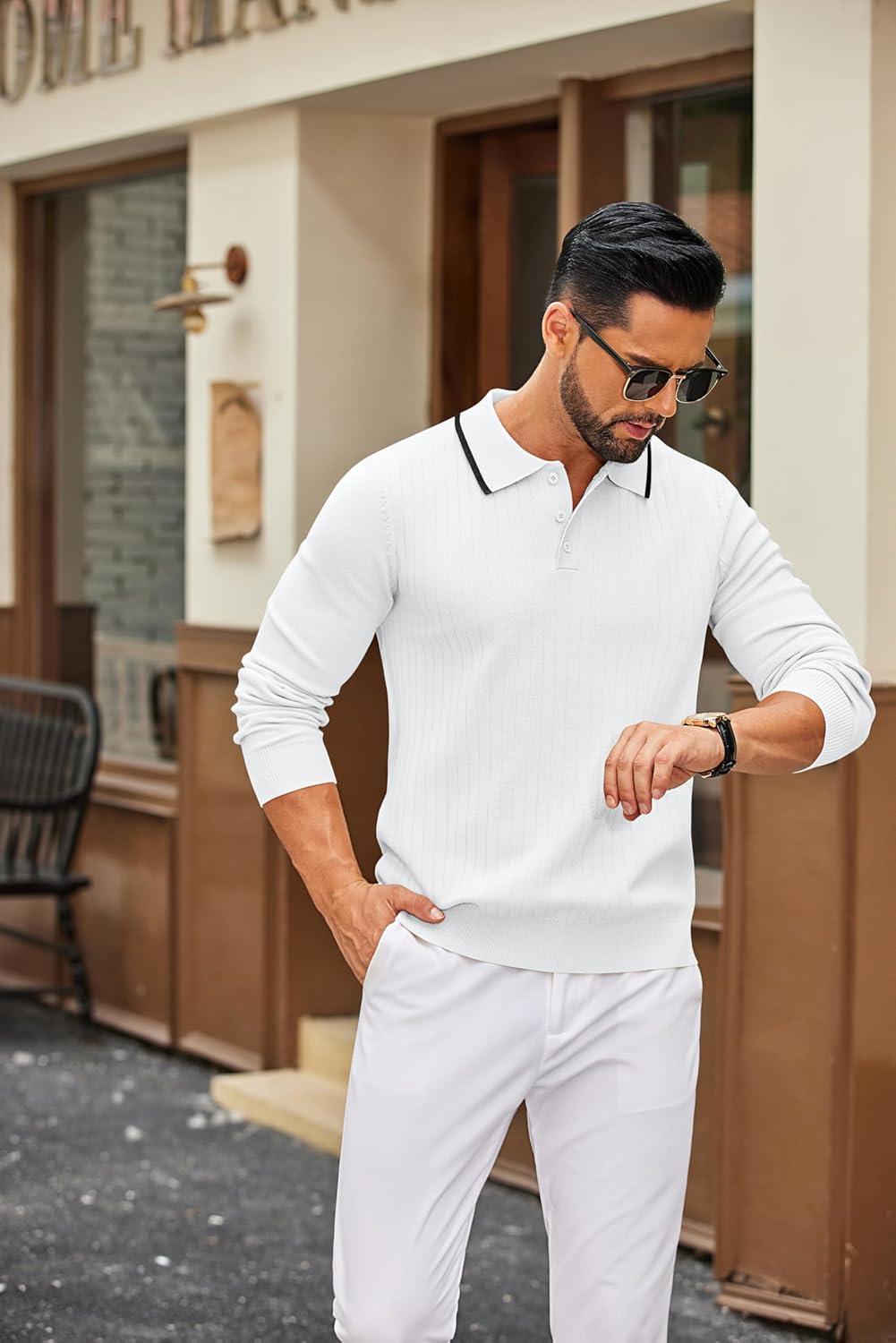 COOFANDY Men’s Knit Polo Sweater Casual Long Sleeve Polo Sweater Lightweight Button Down Golf Pullover Sweaters(White)