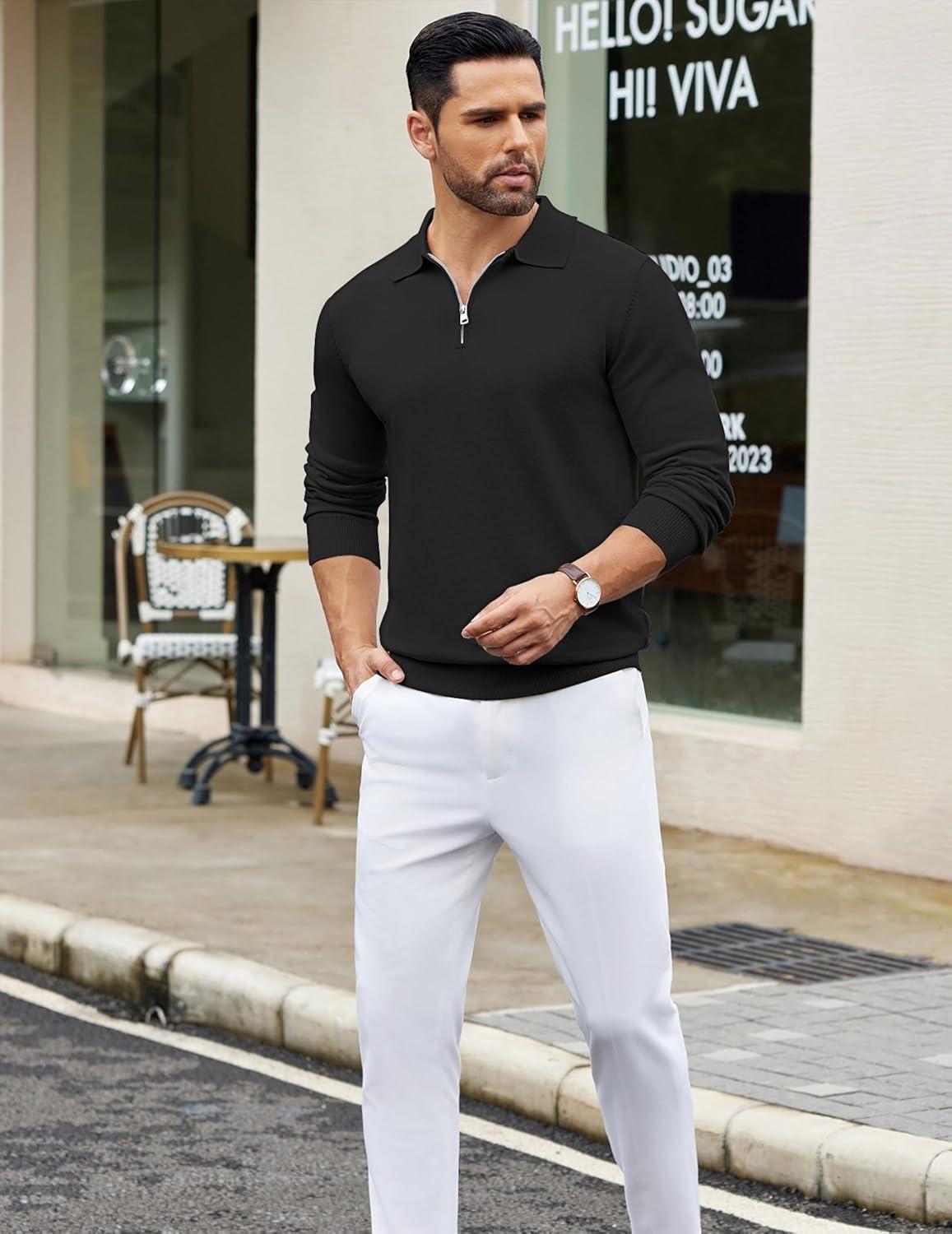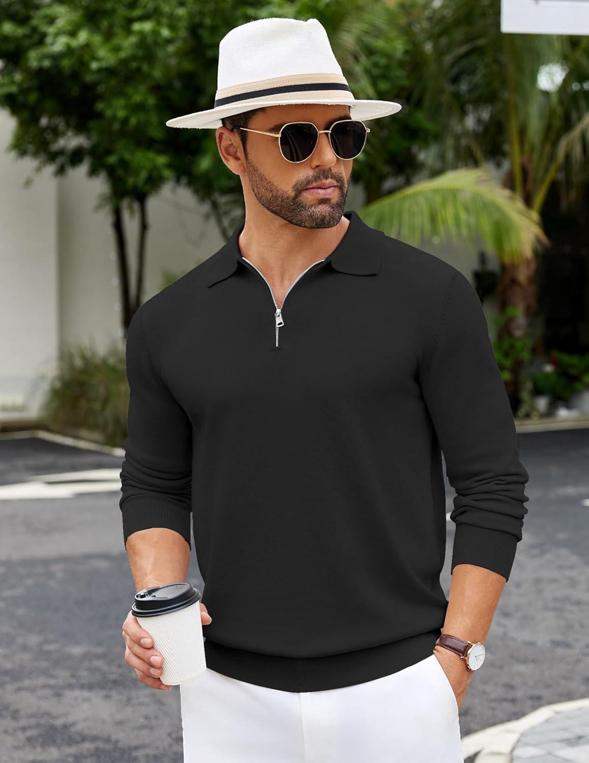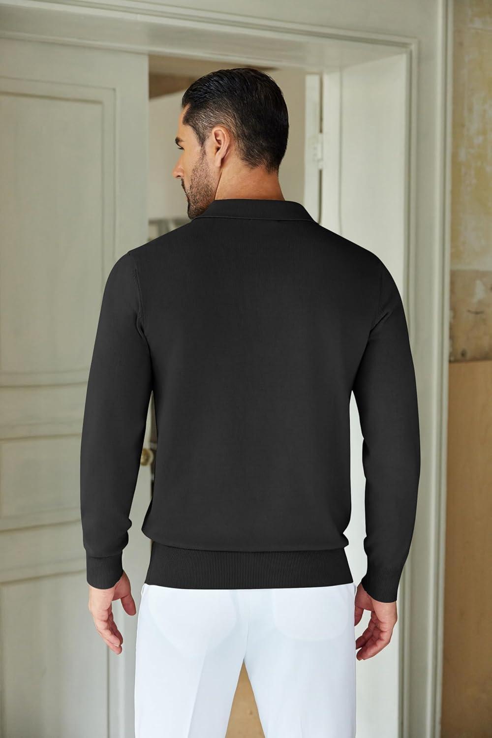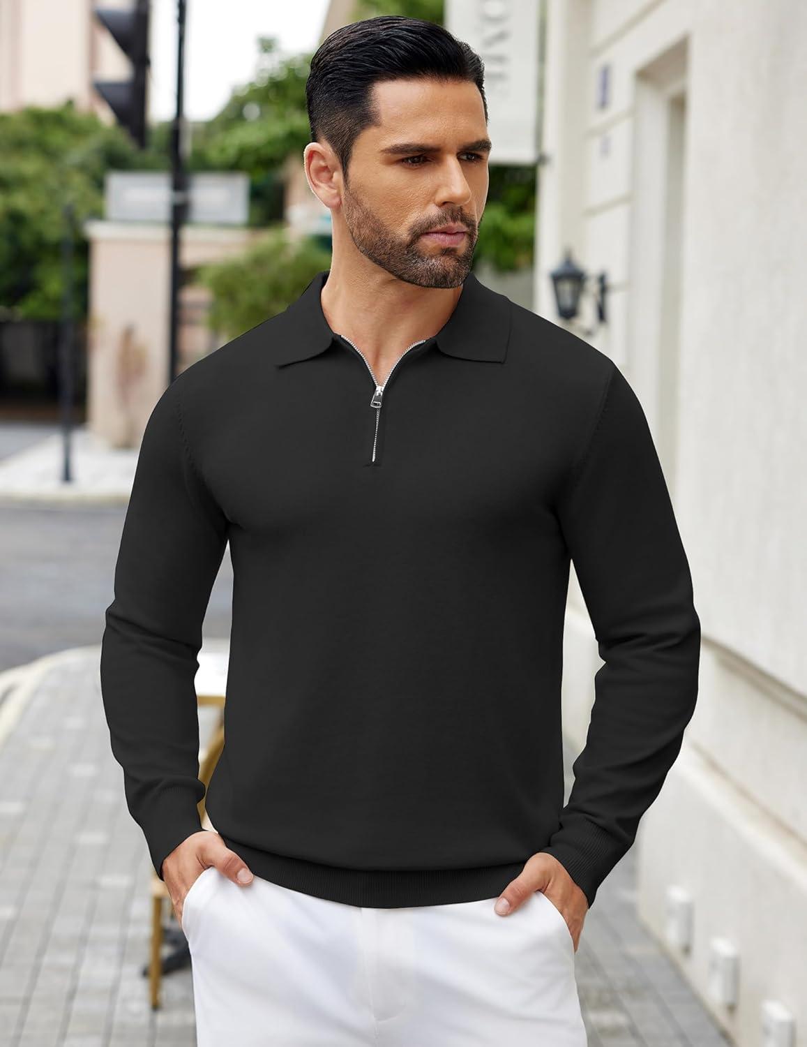 COOFANDY Mens Knit Polo Sweater Casual Long Sleeve Quarter Zip Polo Sweater Classic Golf Shirts(Black)