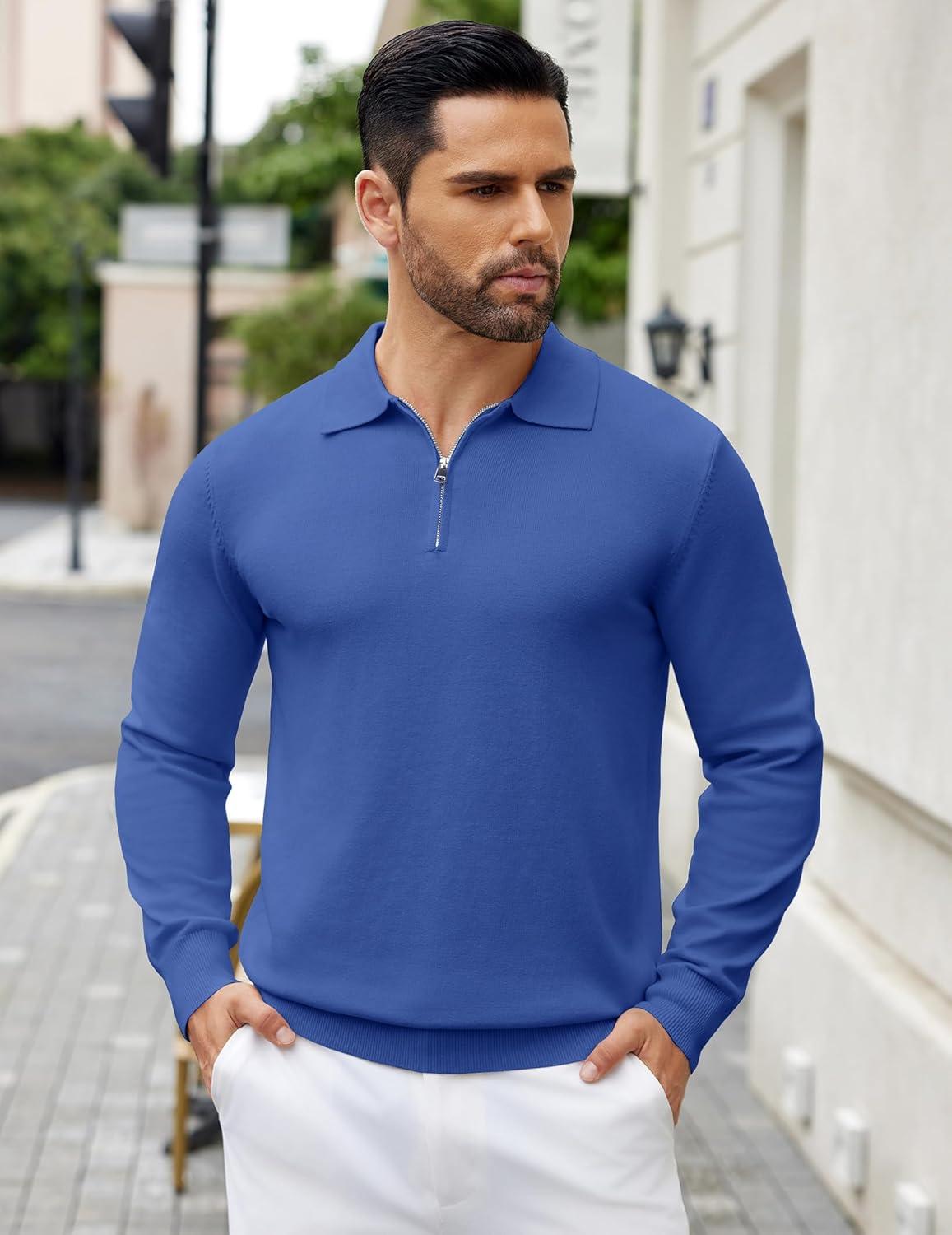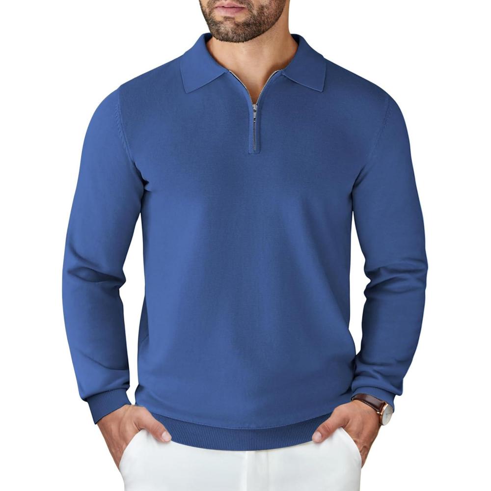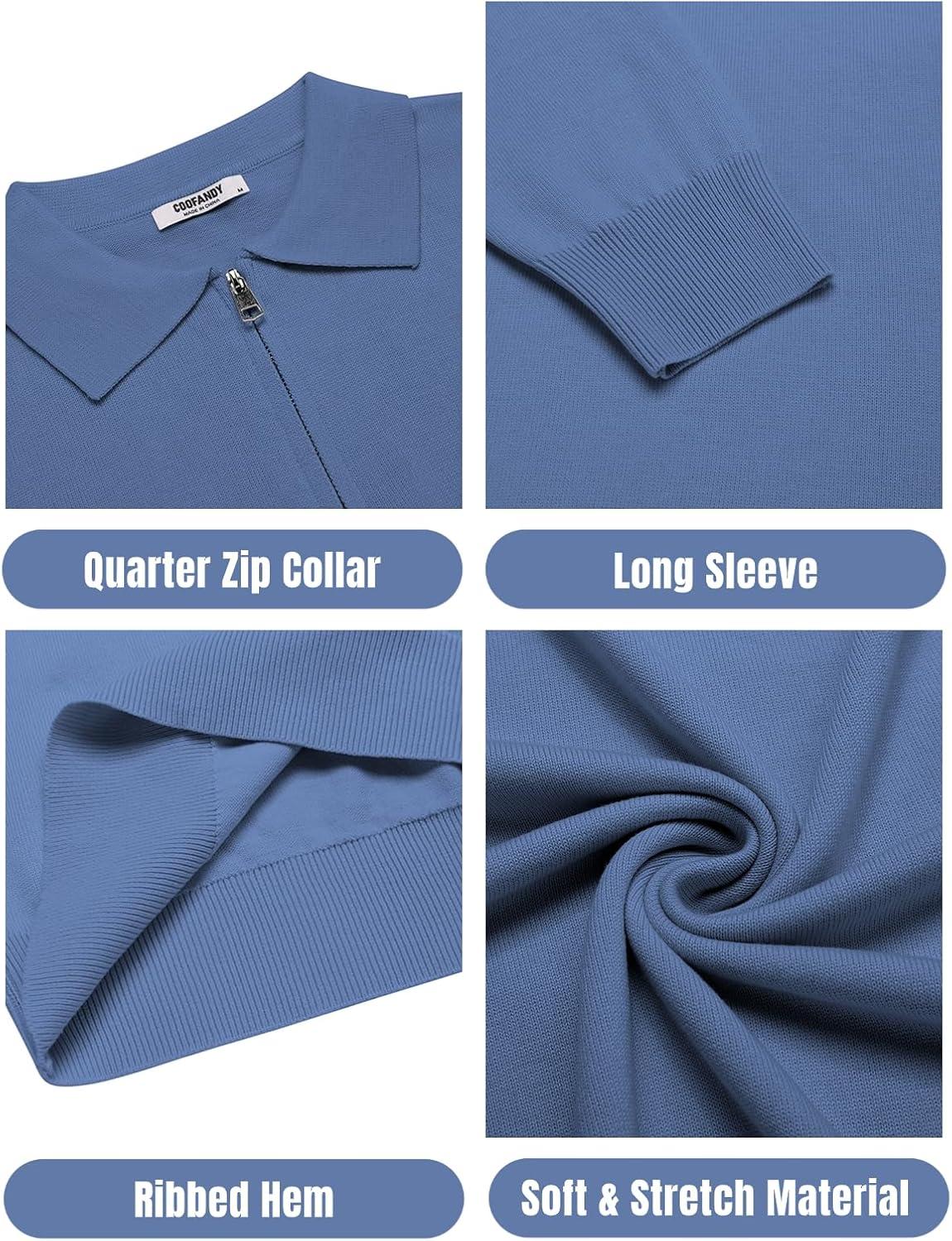 COOFANDY Mens Knit Polo Sweater Casual Long Sleeve Quarter Zip Polo Sweater Classic Golf Shirts(Denim Blue)