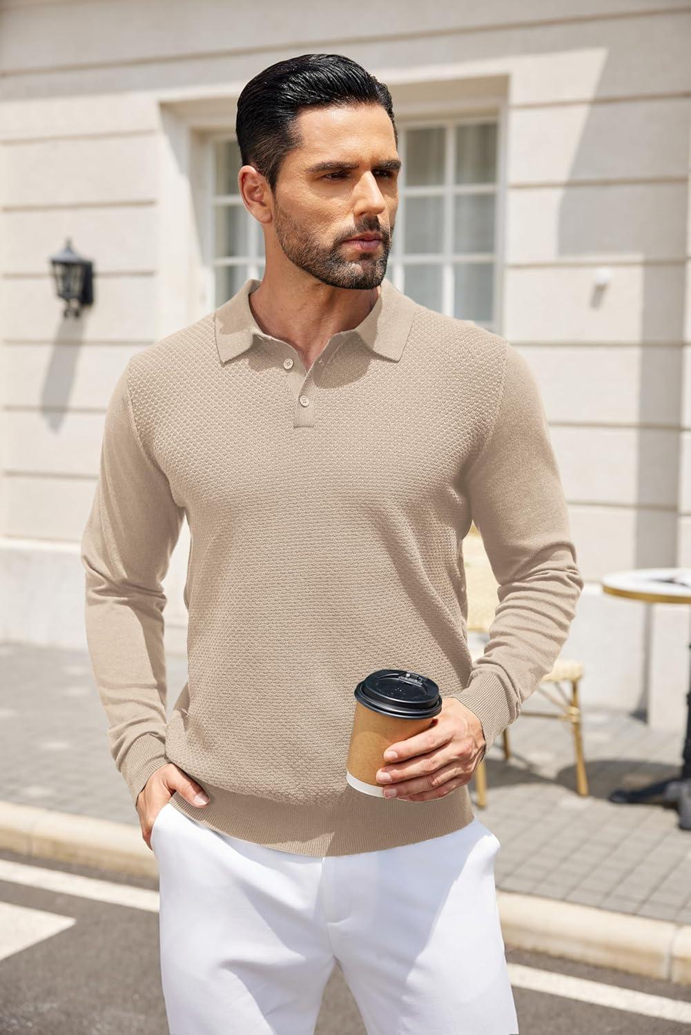 COOFANDY Men's Knit Polo Sweater Long Sleeve Casual Collared Quarter Button Golf Waffle Textured Sweater(Apricot)