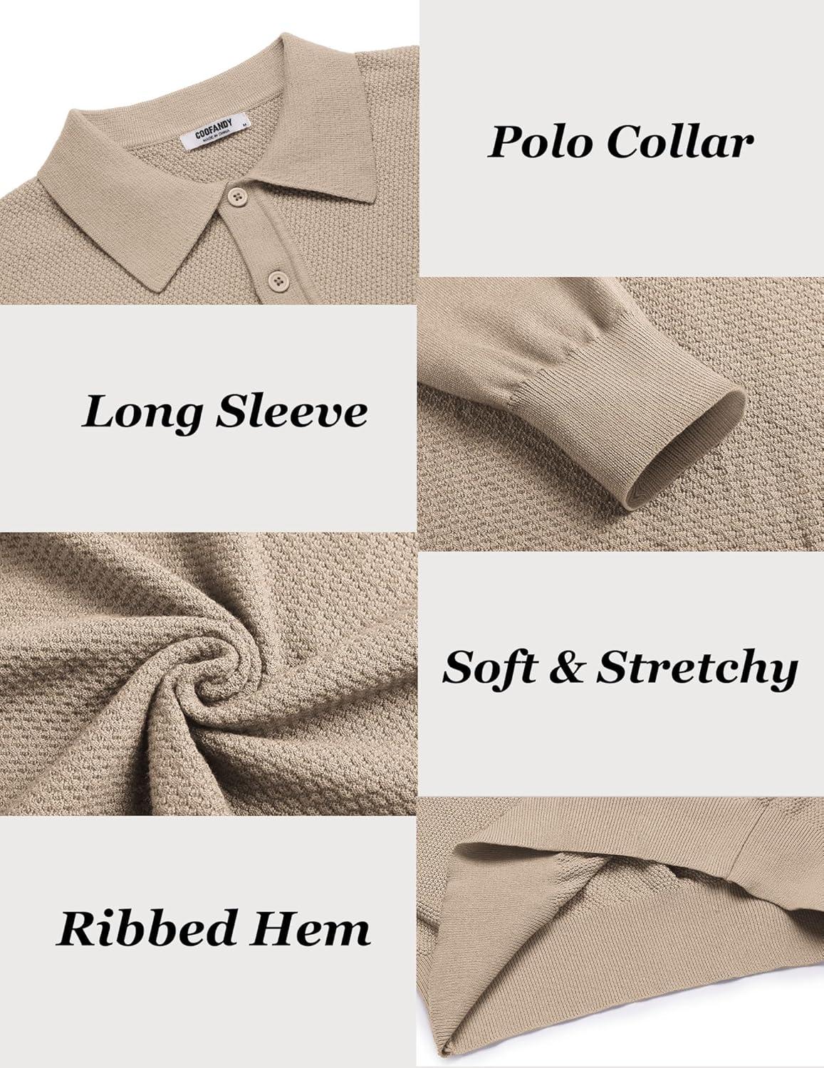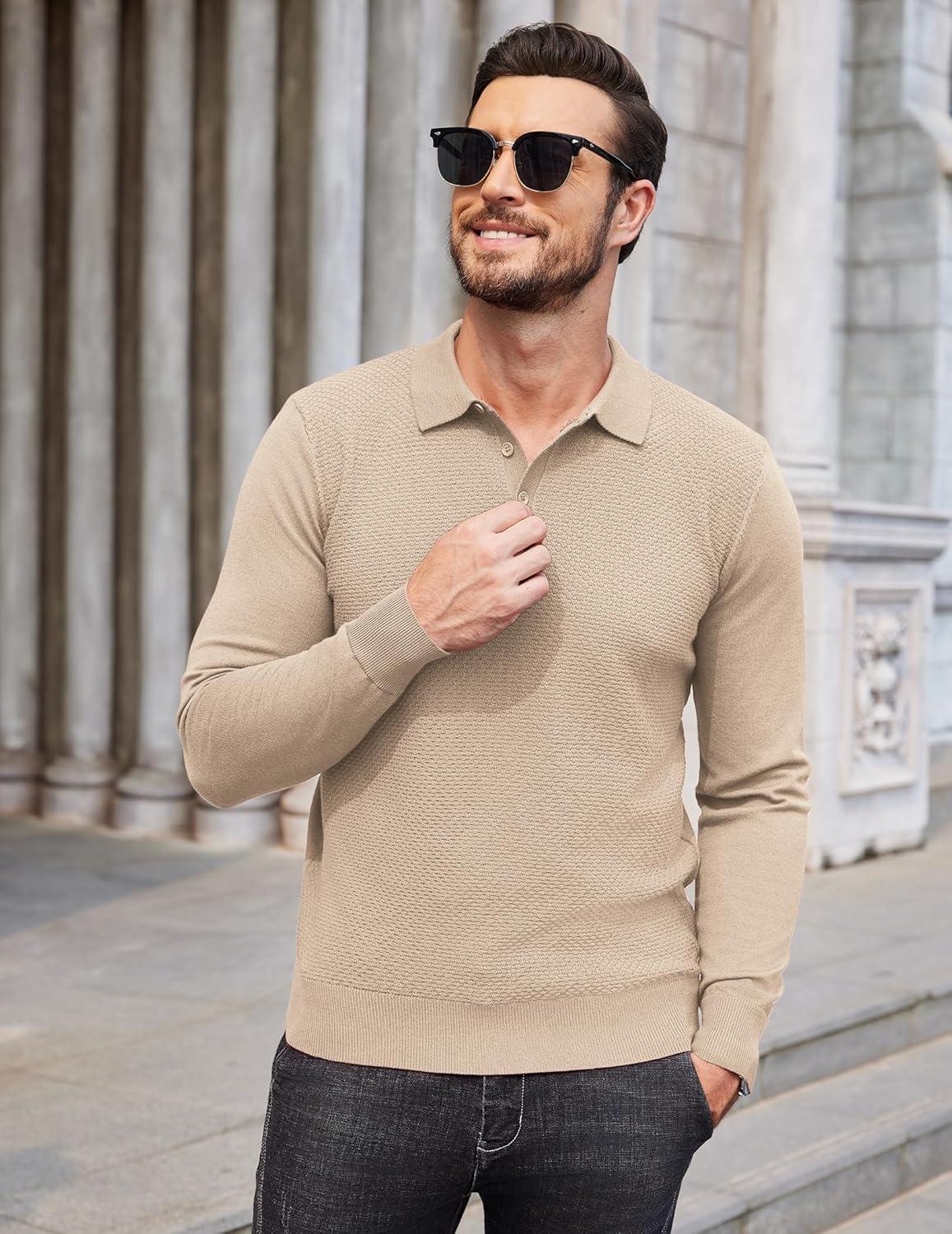 COOFANDY Men’s Knit Polo Sweater Long Sleeve Casual Collared Quarter Button Golf Waffle Textured Sweater(Apricot)