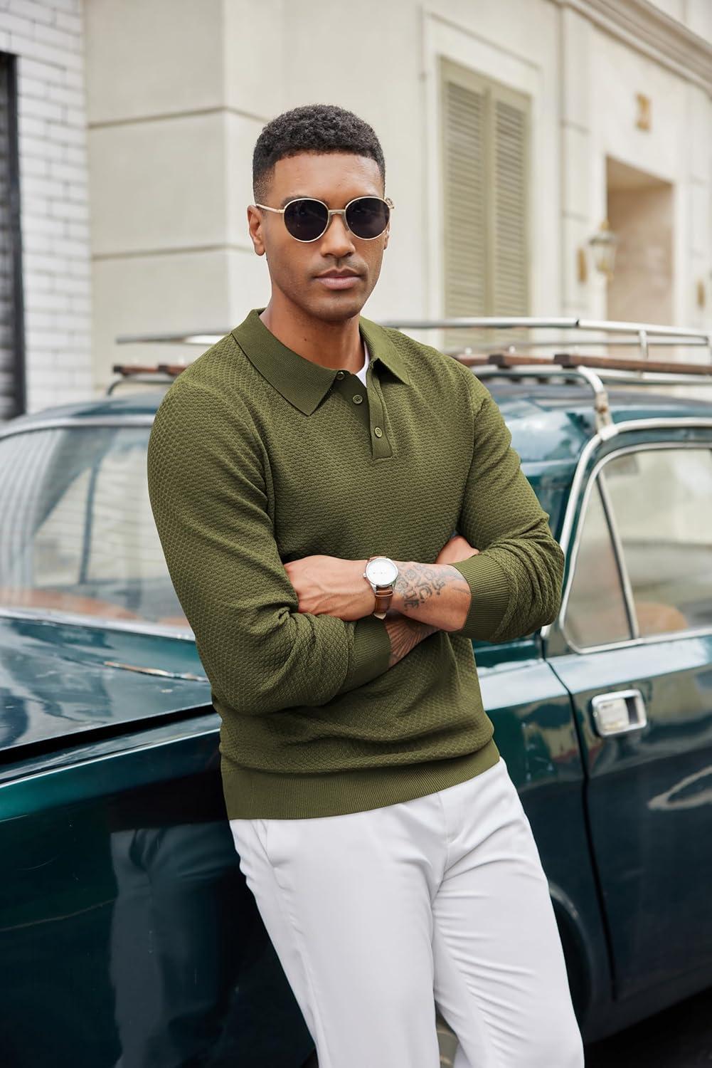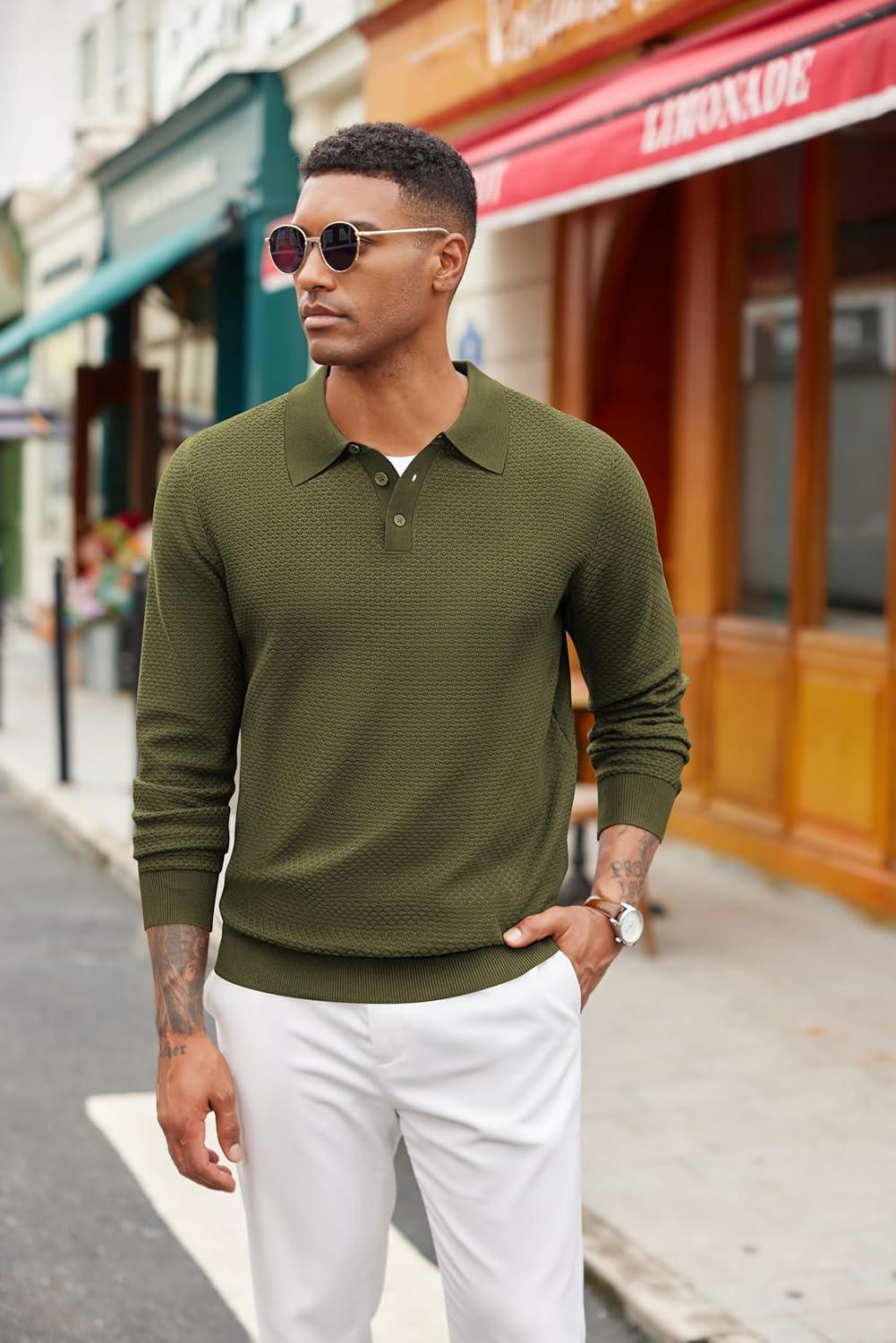 COOFANDY Men’s Knit Polo Sweater Long Sleeve Casual Collared Quarter Button Golf Waffle Textured Sweater(Armygreen)