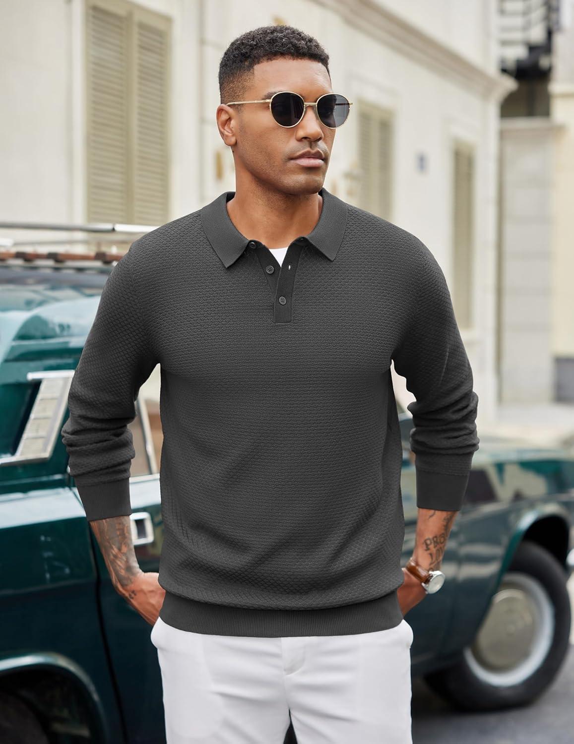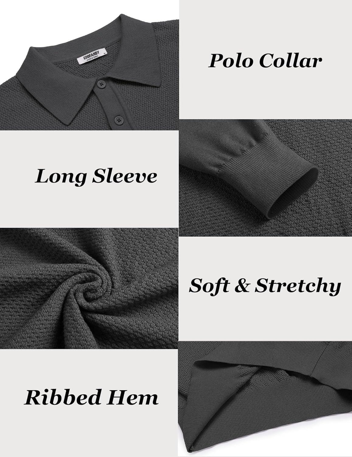 COOFANDY Men's Knit Polo Sweater Long Sleeve Casual Collared Quarter Button Golf Waffle Textured Sweater(Dark Gray)