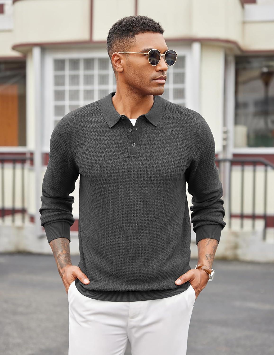 COOFANDY Men’s Knit Polo Sweater Long Sleeve Casual Collared Quarter Button Golf Waffle Textured Sweater(Dark Gray)