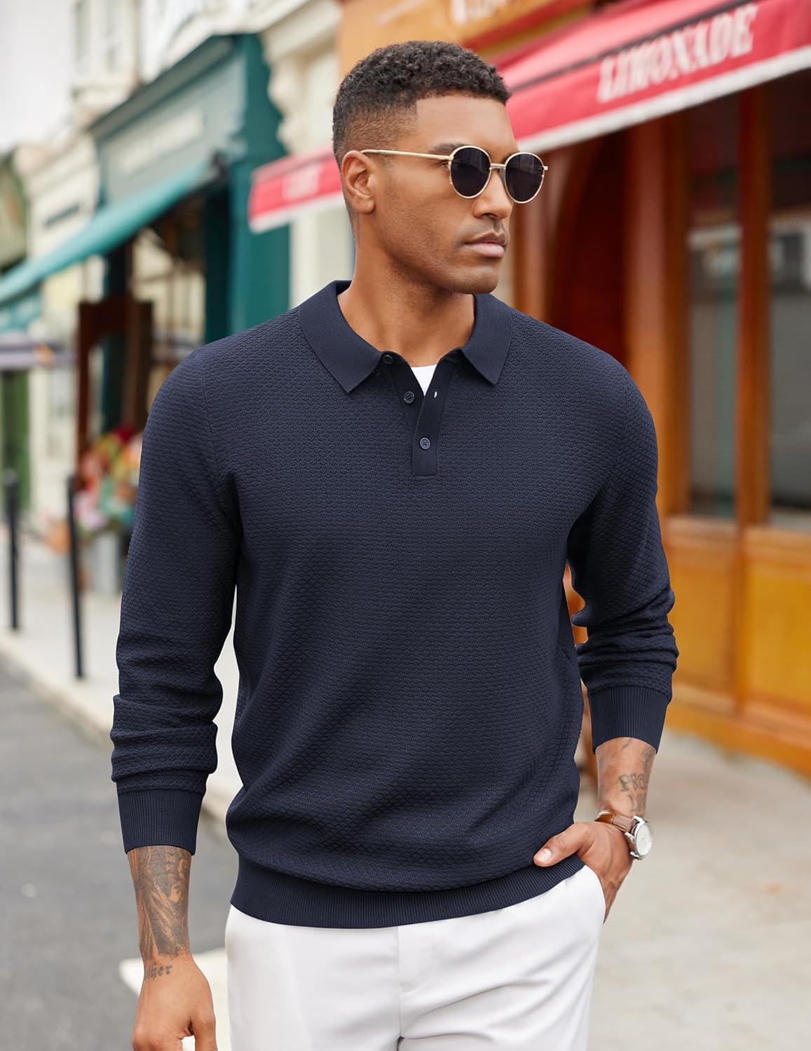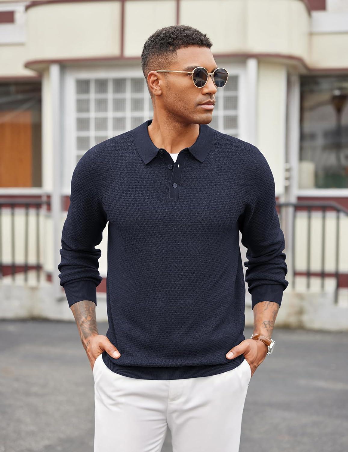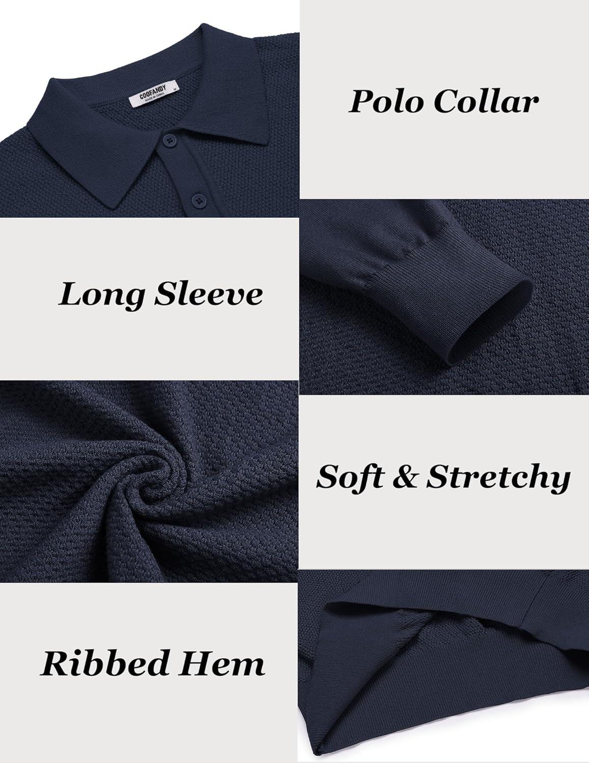 COOFANDY Men's Knit Polo Sweater Long Sleeve Casual Collared Quarter Button Golf Waffle Textured Sweater(Dark Navy Blue-1)