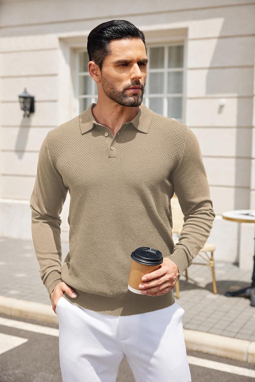 COOFANDY Men’s Knit Polo Sweater Long Sleeve Casual Collared Quarter Button Golf Waffle Textured Sweater(Khaki-1)
