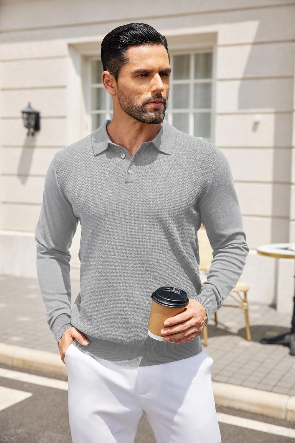 COOFANDY Men's Knit Polo Sweater Long Sleeve Casual Collared Quarter Button Golf Waffle Textured Sweater(Light Grey)