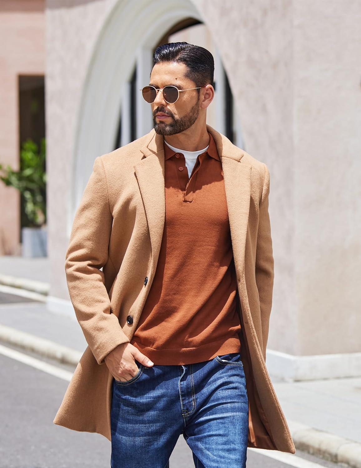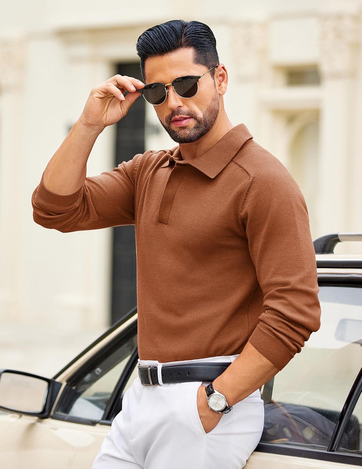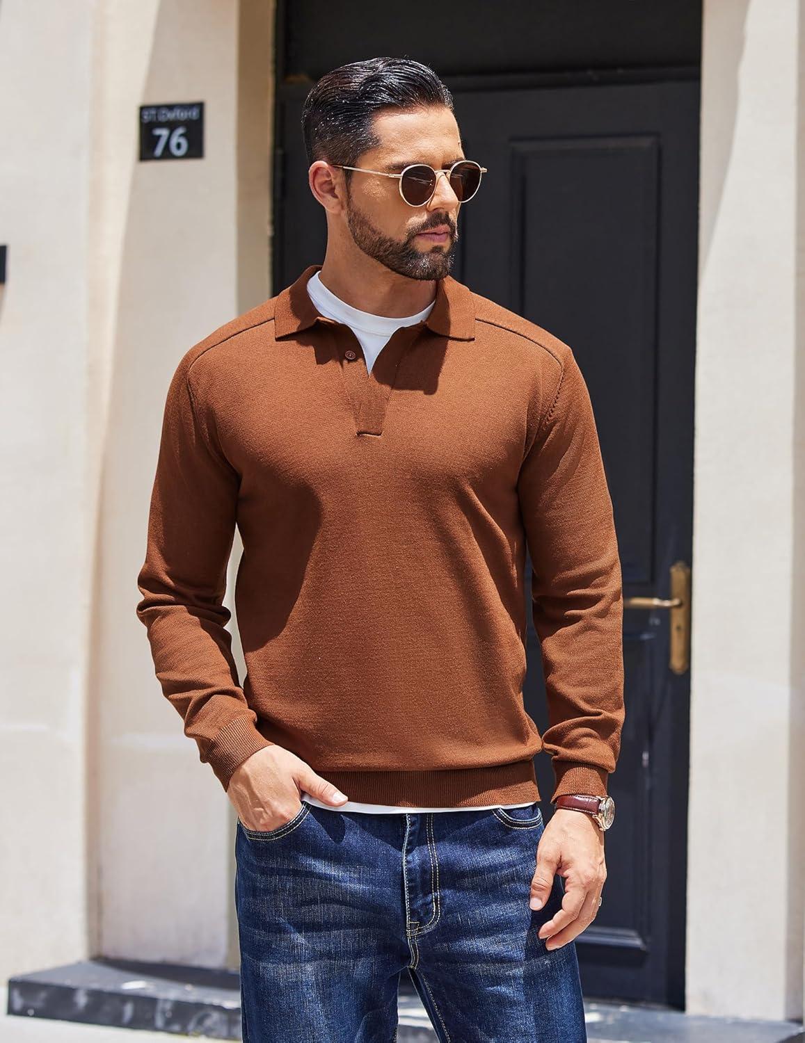COOFANDY Mens Knit Polo Sweater Long Sleeve Polo Collared Sweaters Hidden Button Casual Pullover Sweater(Brown)