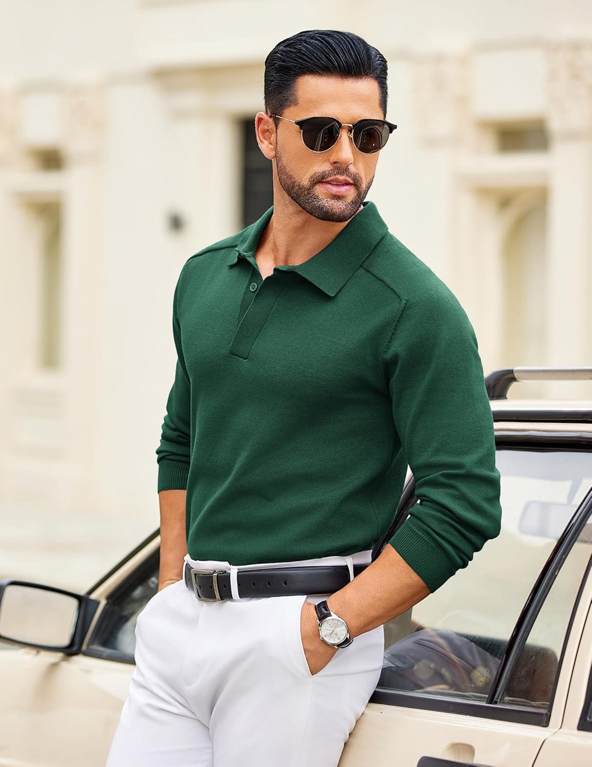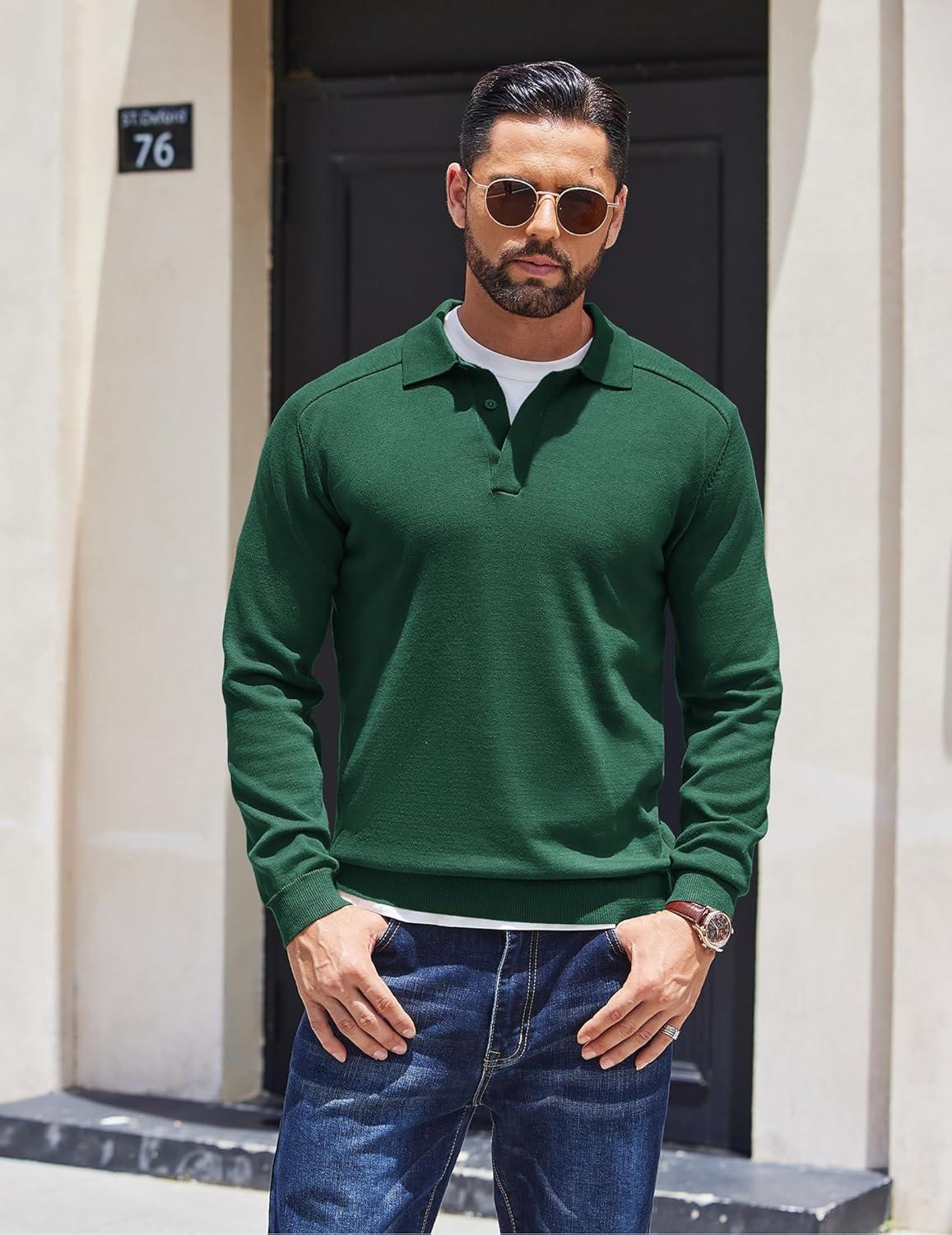 Save big on COOFANDY Mens Knit Polo Sweater Long Sleeve Polo Collared Sweaters Hidden Button Casual Pullover Sweater(Dark Green) during our summer blowout sale. Limited quantities available.