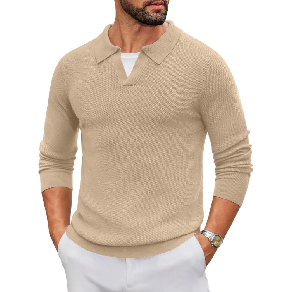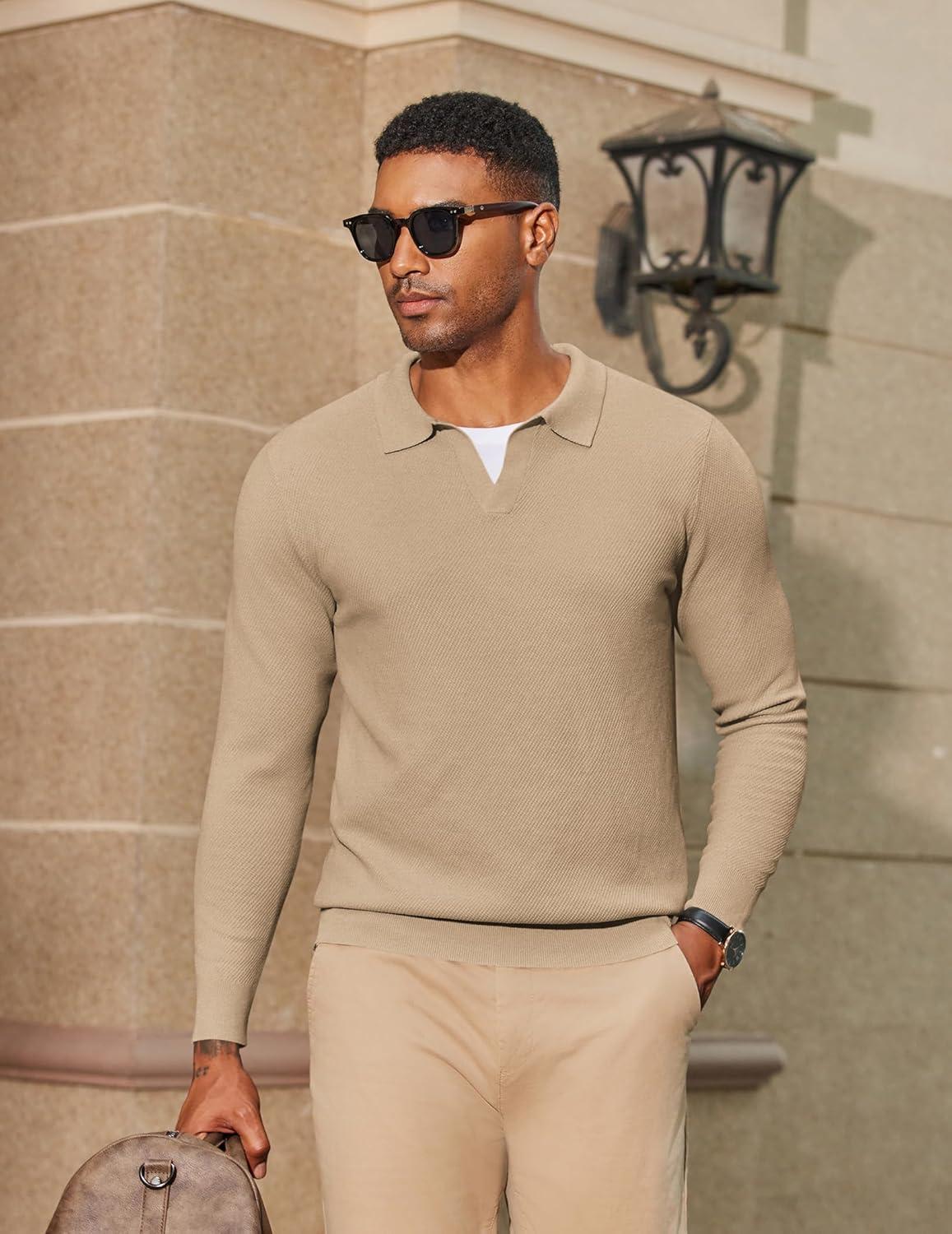 COOFANDY Men's Knit Polo Sweater Long Sleeve V-Neck Pullover Sweaters Casual Collared Ribbed Knitted Polos(Light Khaki)