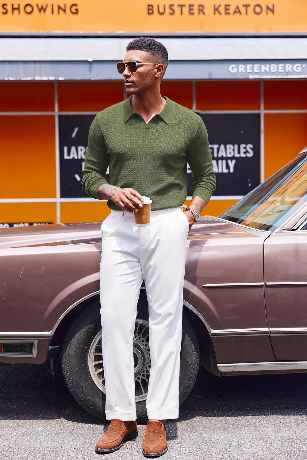 COOFANDY Mens Knit Polo Sweater V-Neck Long Sleeve Textured Lightweight Casual Dress Pullover Fall Sweaters(Army Green)