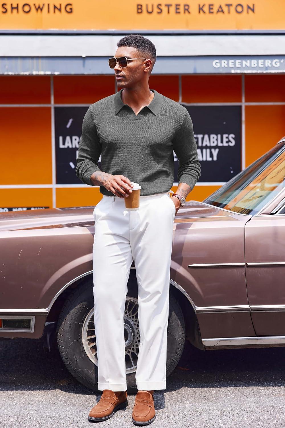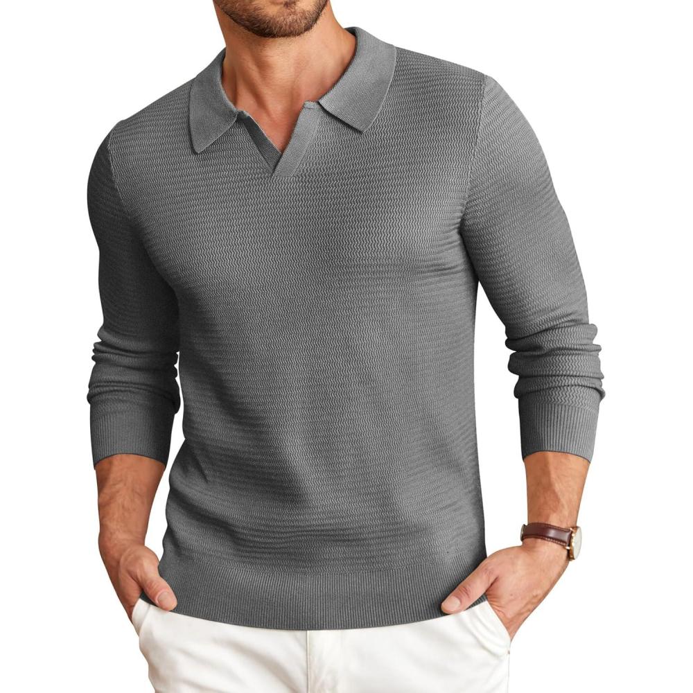 COOFANDY Mens Knit Polo Sweater V-Neck Long Sleeve Textured Lightweight Casual Dress Pullover Fall Sweaters(Dark Grey)