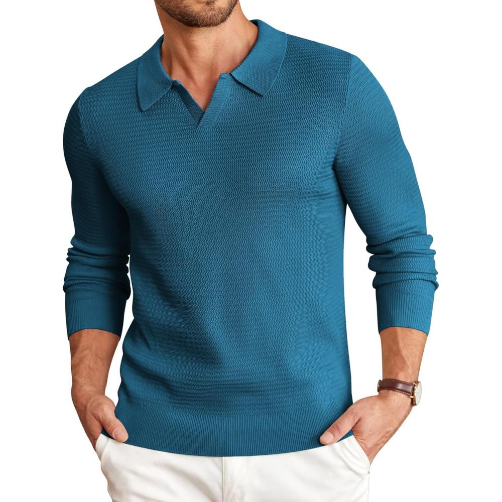 COOFANDY Mens Knit Polo Sweater V-Neck Long Sleeve Textured Lightweight Casual Dress Pullover Fall Sweaters(Peacock Blue)