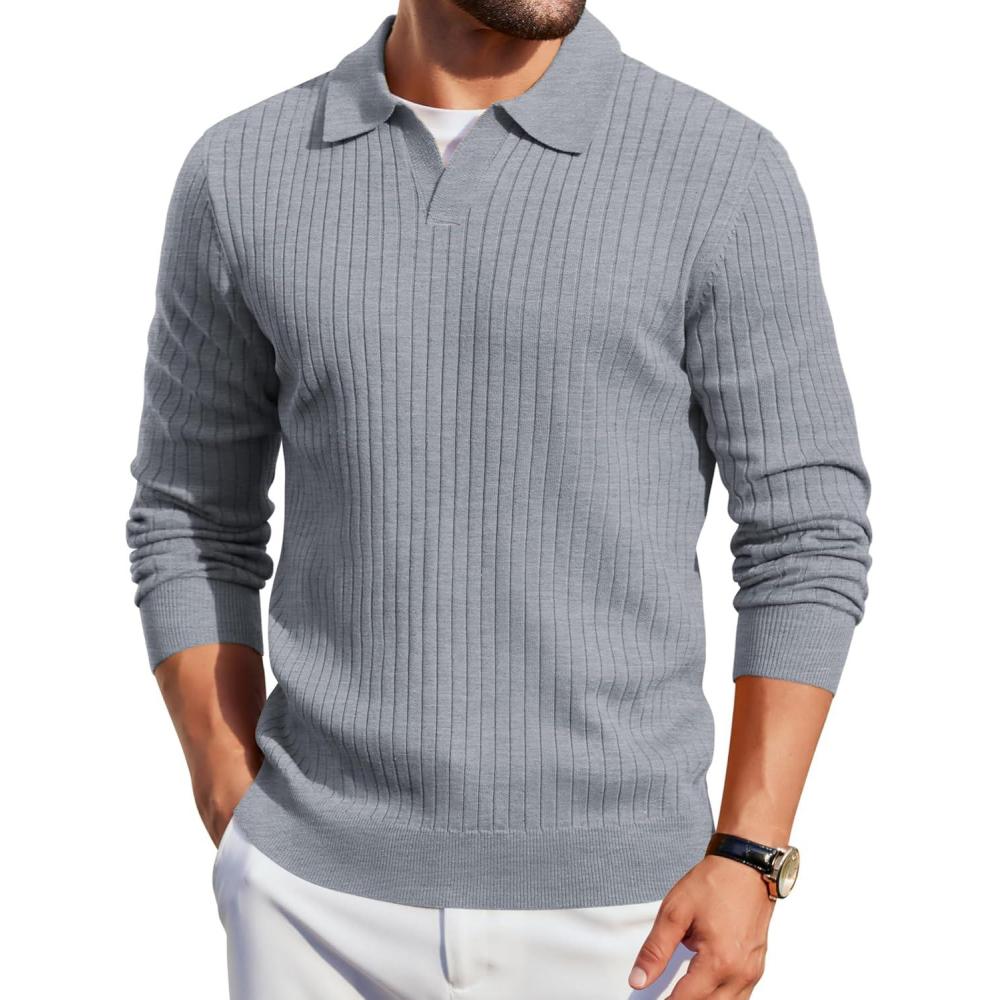 COOFANDY Mens Knit Polos Long Sleeve Casual Sweater Polos V Neck Collared Sweater Golf Polo Sweaters and Pullovers(Light Grey)