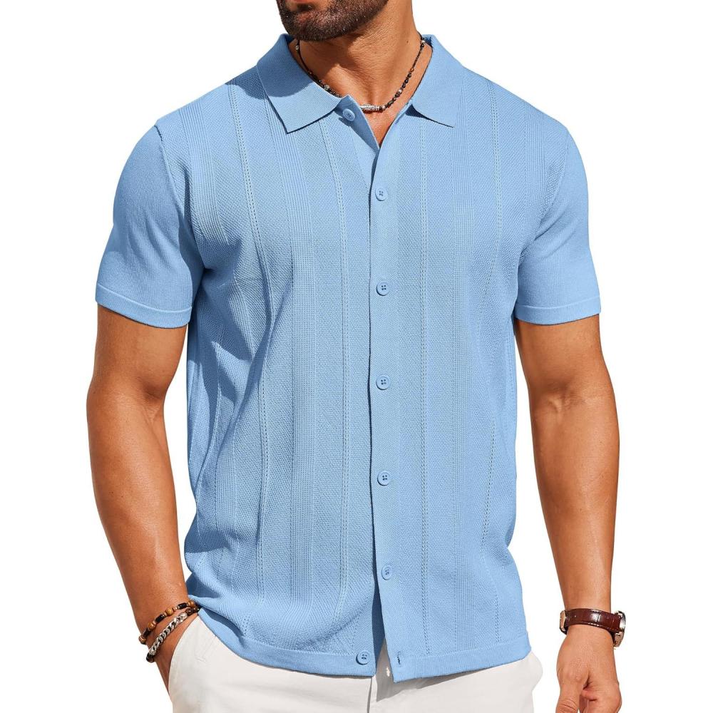 COOFANDY Mens Knit Shirt Short Sleeve Button Down Shirts Casual Summer Beach Vintage Polo Shirts(Light Blue)