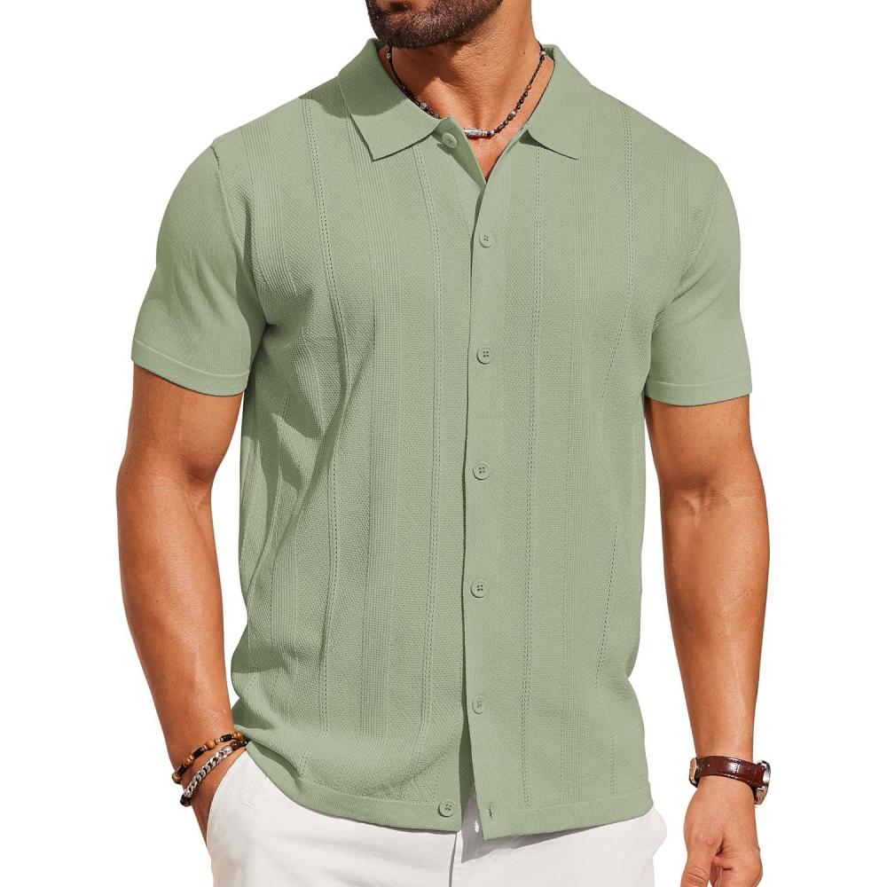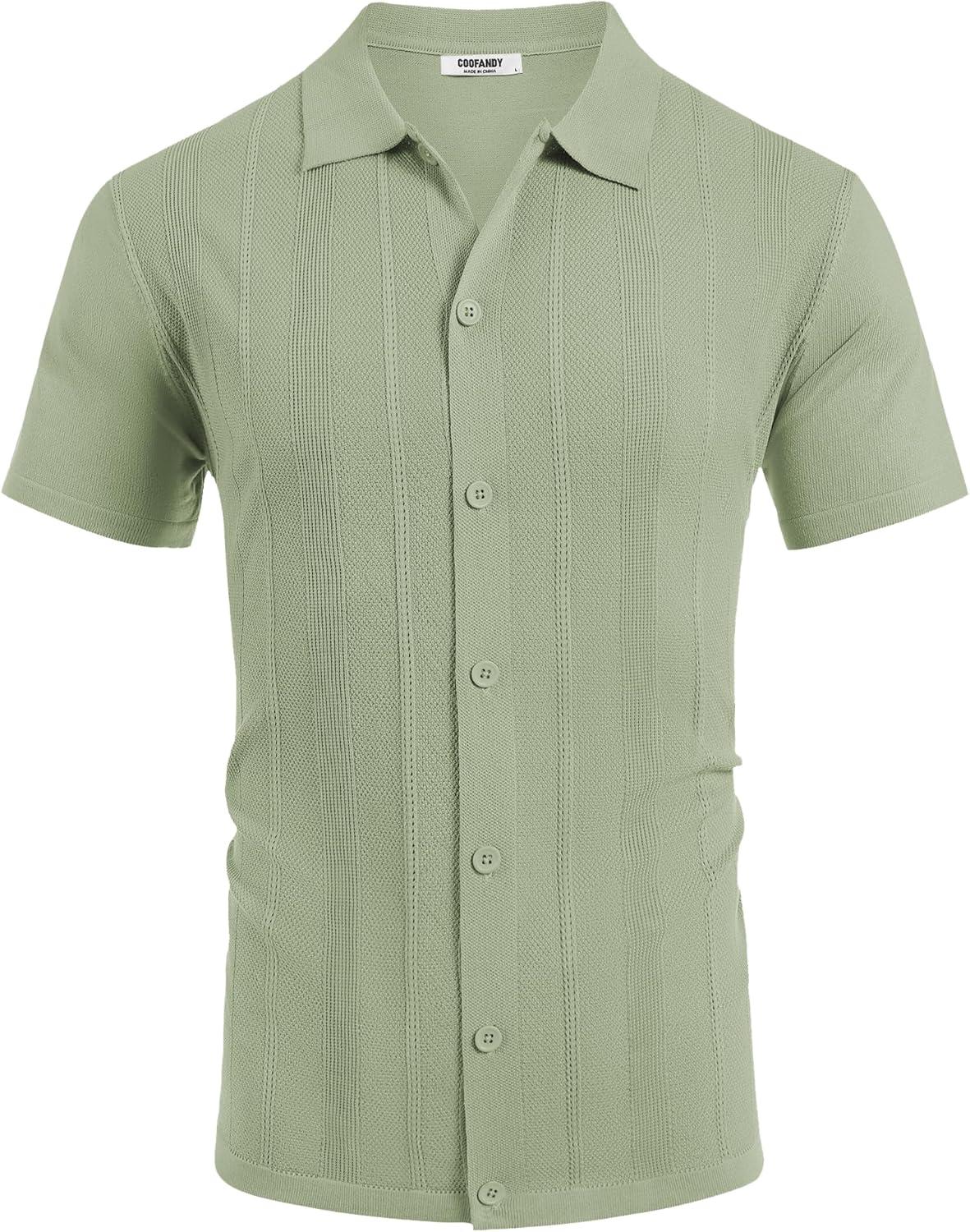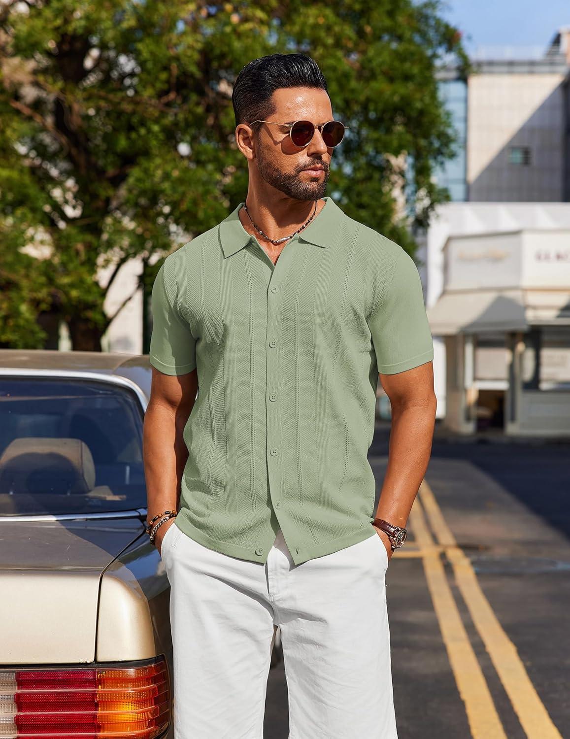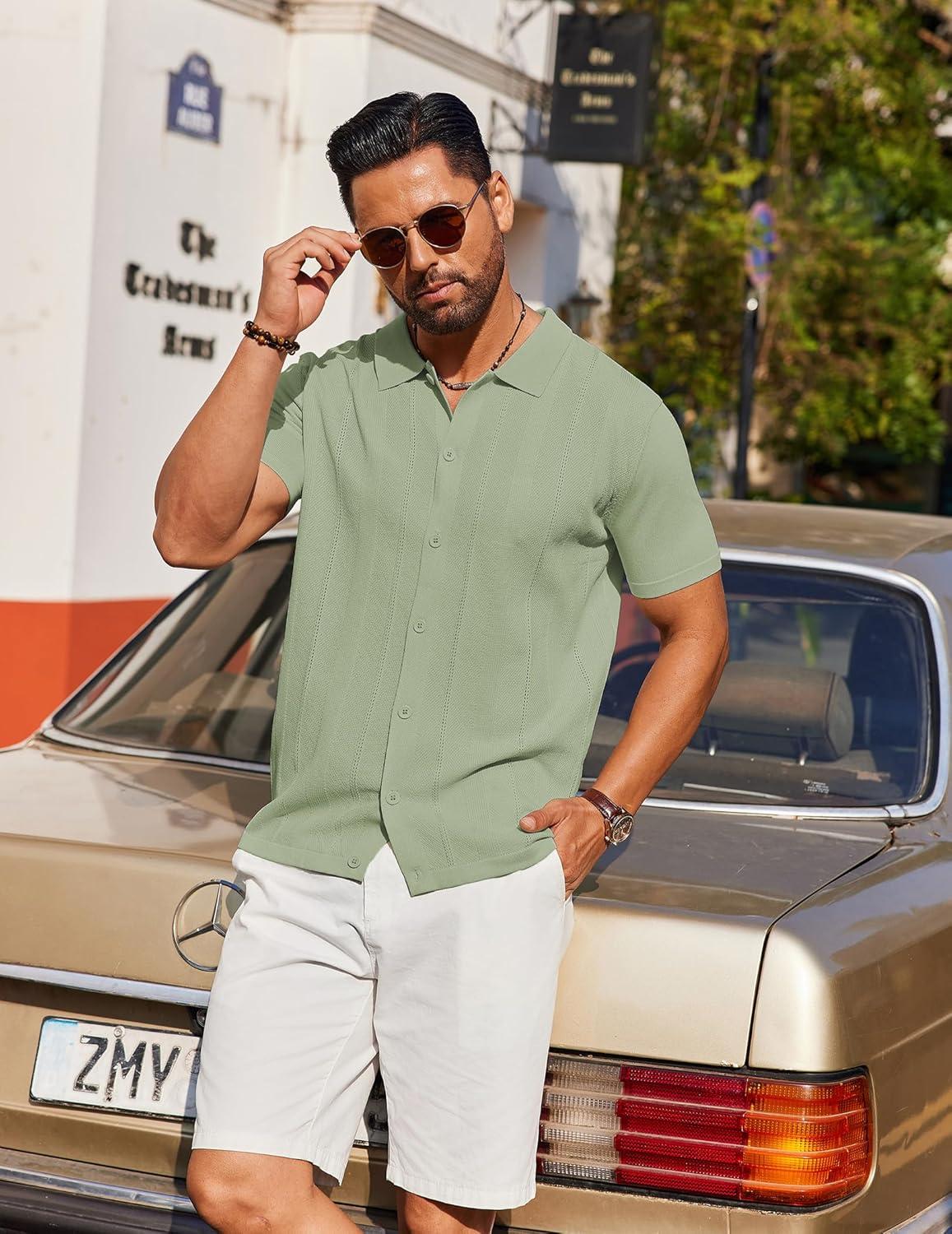 COOFANDY Mens Knit Shirt Short Sleeve Button Down Shirts Casual Summer Beach Vintage Polo Shirts(Light Green)