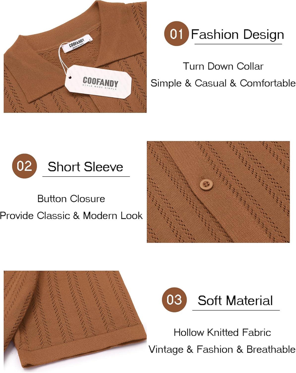 COOFANDY Men’s Knit Shirts Short Sleeve Button Down Polo Shirt Crochet Casual Vintage Summer Beach Shirts(Caramel)