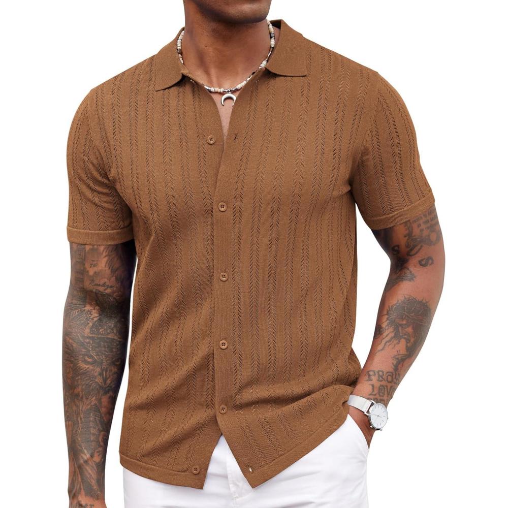 imageCOOFANDY Mens Knit Shirts Short Sleeve Button Down Polo Shirt Crochet Casual Vintage Summer Beach ShirtsCaramel