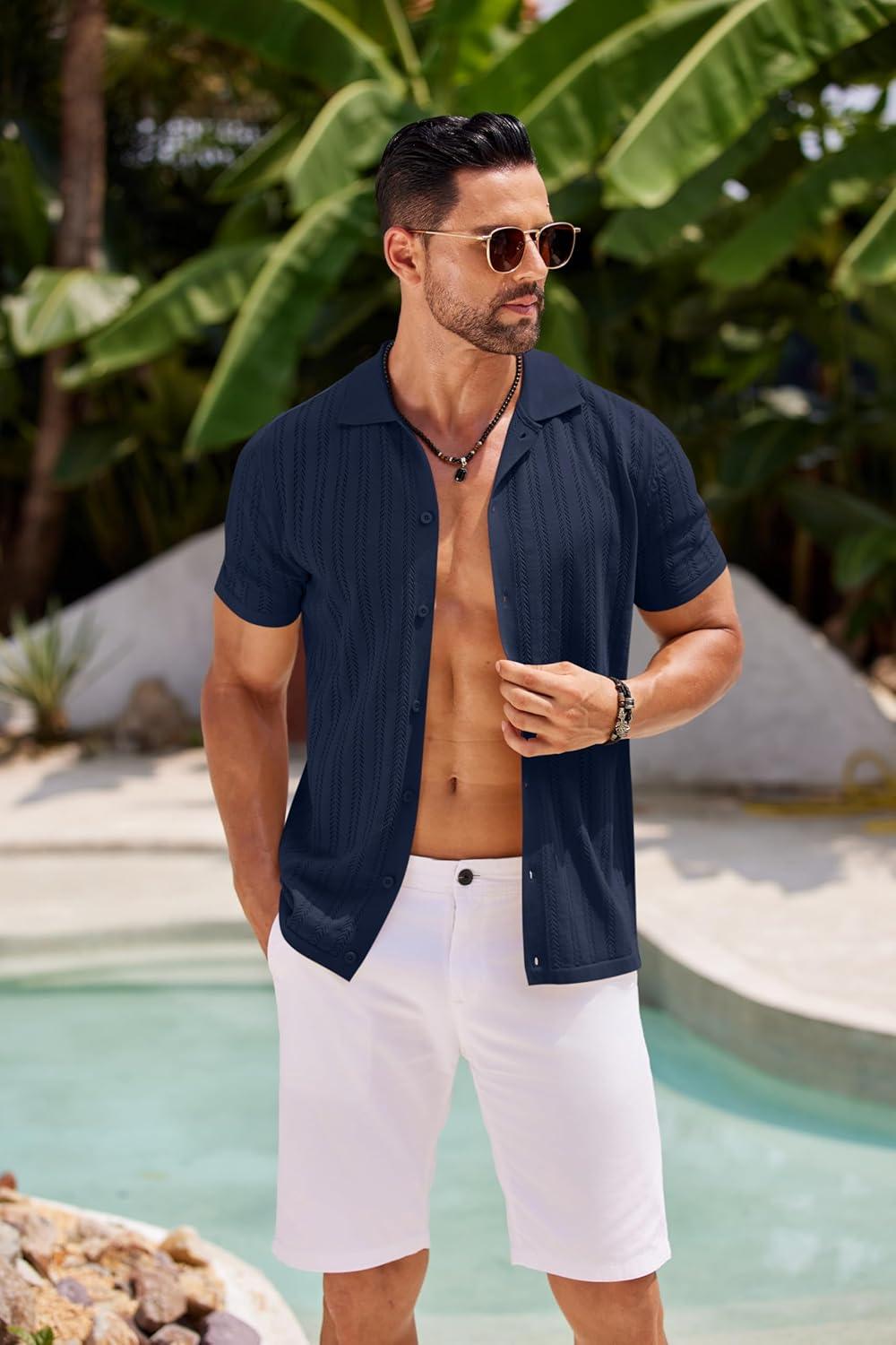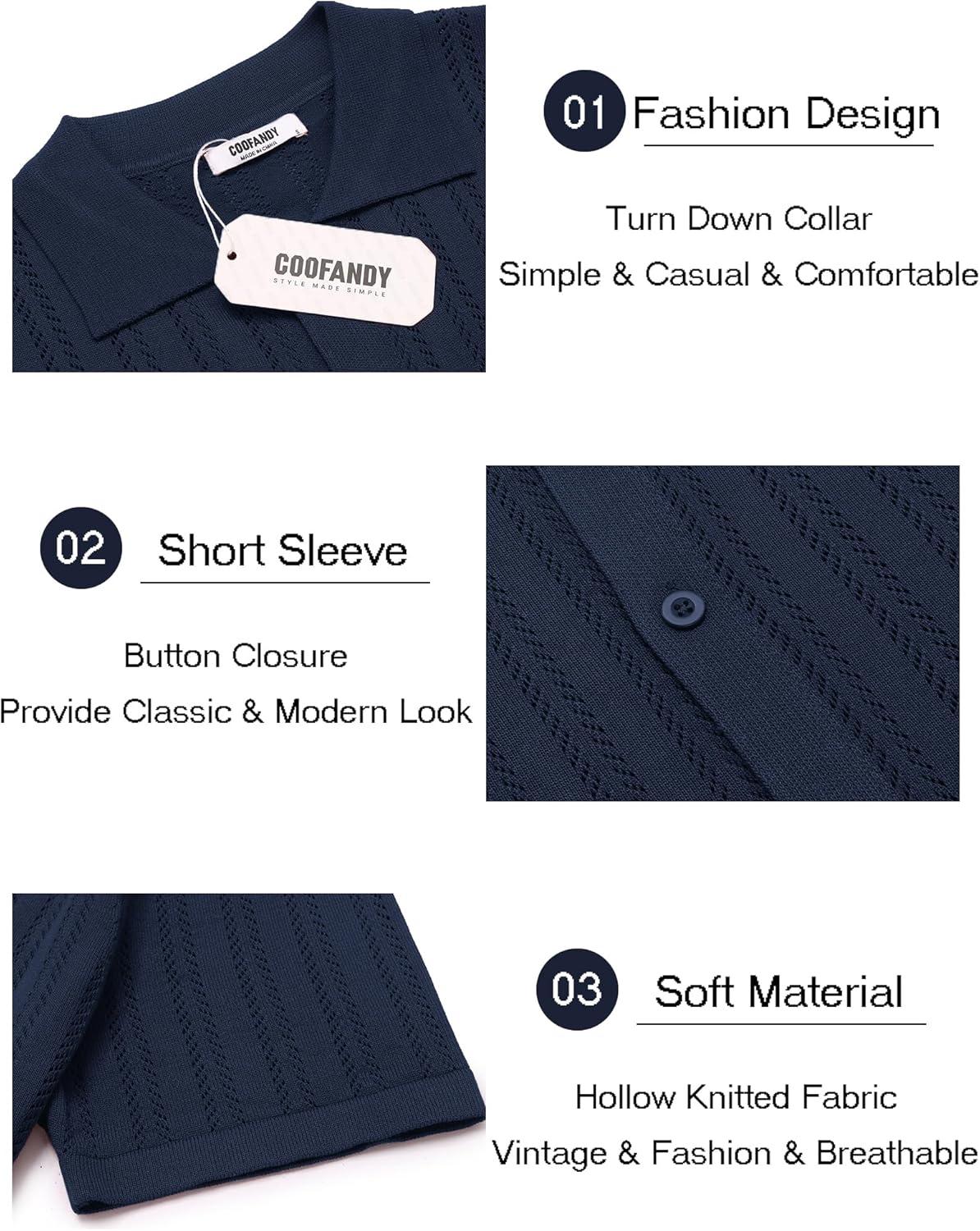 COOFANDY Men’s Knit Shirts Short Sleeve Button Down Polo Shirt Crochet Casual Vintage Summer Beach Shirts(Dark Navy Blue)