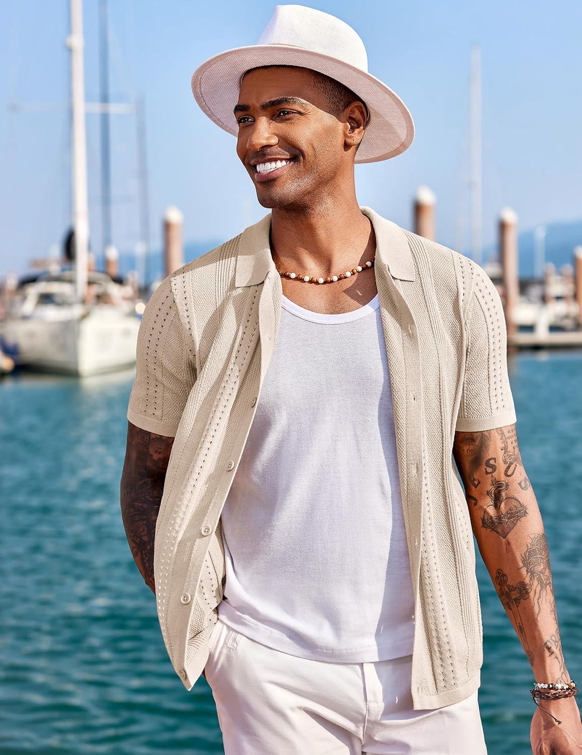 COOFANDY Men's Knit Shirts Short Sleeve Button Down Polo Shirt Fashion Casual Summer Beach Shirts(Apricot)