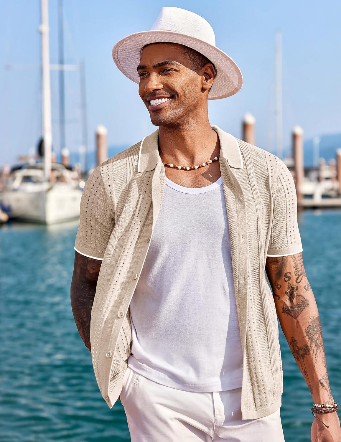 COOFANDY Men’s Knit Shirts Short Sleeve Button Down Polo Shirt Fashion Casual Summer Beach Shirts(Classic Black & White)